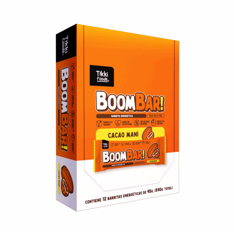 Display 12 unidades. sabor cacao – mani (45grs c/u) energía pura cuando la necesitas. barritas energéticas «raw» elaboradas con avena, mantequilla de maní tikki y dátiles. sin azúcar añadida, libres de sellos, veganas. perfectas para el deporte, colaciones o aventuras outdoor. disponibles en 3 sabores irresistibles: maní, maní coco y maní chocolate. dale un boom! de energía a tu día.