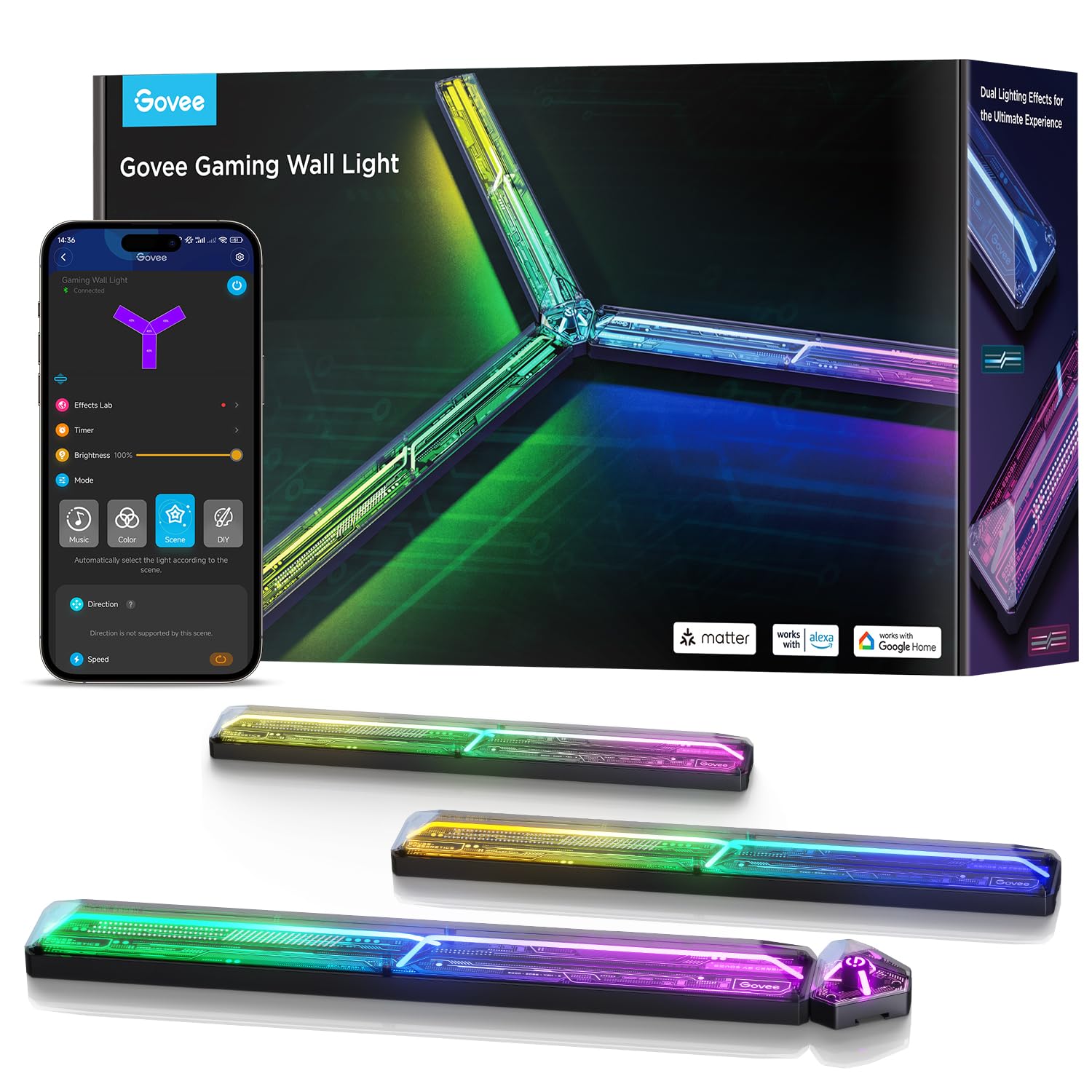 Lámpara de pared govee gaming, lámpara de pared rgbic glide, work with matter, alexa y google assistant, efectos y formas de iluminación de pared led personalizados, luces de juego para sala de juegos, luces de pared para sala de juegos, luces de juego para pared, luces de juego govee, lámpara de pared govee glide con 8 modos de música y 61 modos de escena, contiene 3 secciones de luz con 1 conector, estilo cyberpunk: estas luces govee glide con 8 modos de música y 61 modos de escena, contiene 3 secciones de luz con 1 conector, estilo cyberpunk: estas luces govee glide combina paneles difusores de luz de alta transparencia con intrincados patrones de placas de circuitos en la base led, creando un elegante diseño de alta tecnología estética, ideal para cualquier espacio que busque una transformación moderna y futurista. - efectos de iluminación especiales para hacer tú mismo: la iluminación de la placa frontal y las líneas de difusión del aplique de pared se pueden controlar por separado, con 16 millones de efectos de iluminación rgbic y 61 modos de escena para crear y personalizar los efectos de iluminación que desees. - construcción futurista de doble capa: estos apliques de pared govee glide combinan una base led con una placa transparente y una tira de luz de difusión elevada, lo que crea un efecto de iluminación dual que ofrece una experiencia de iluminación tridimensional definitiva en el espacio. - control compatible con matter: estas luces led inteligentes para juegos son compatibles con matter para que las controlen terceros, alexa y el asistente de google para un control por voz sencillo con manos libres, y con la aplicación govee home para configurar rutinas y comandos desde cualquier lugar. - crea aún más estilos: descubre placas frontales intercambiables, paquetes de accesorios para conectores y segmentos de luz adicionales para personalizar aún más las luces de juego. crea tus propios estilos de decoración exclusivos y transforma tu sala de juegos en un festín visual. - nota: el producto contiene 3 secciones de luz, 1 conector triangular, 1 adaptador de corriente y 1 caja de control. la expansión está disponible para empalmes gratuitos. un adaptador puede soportar hasta 12 secciones de luz.