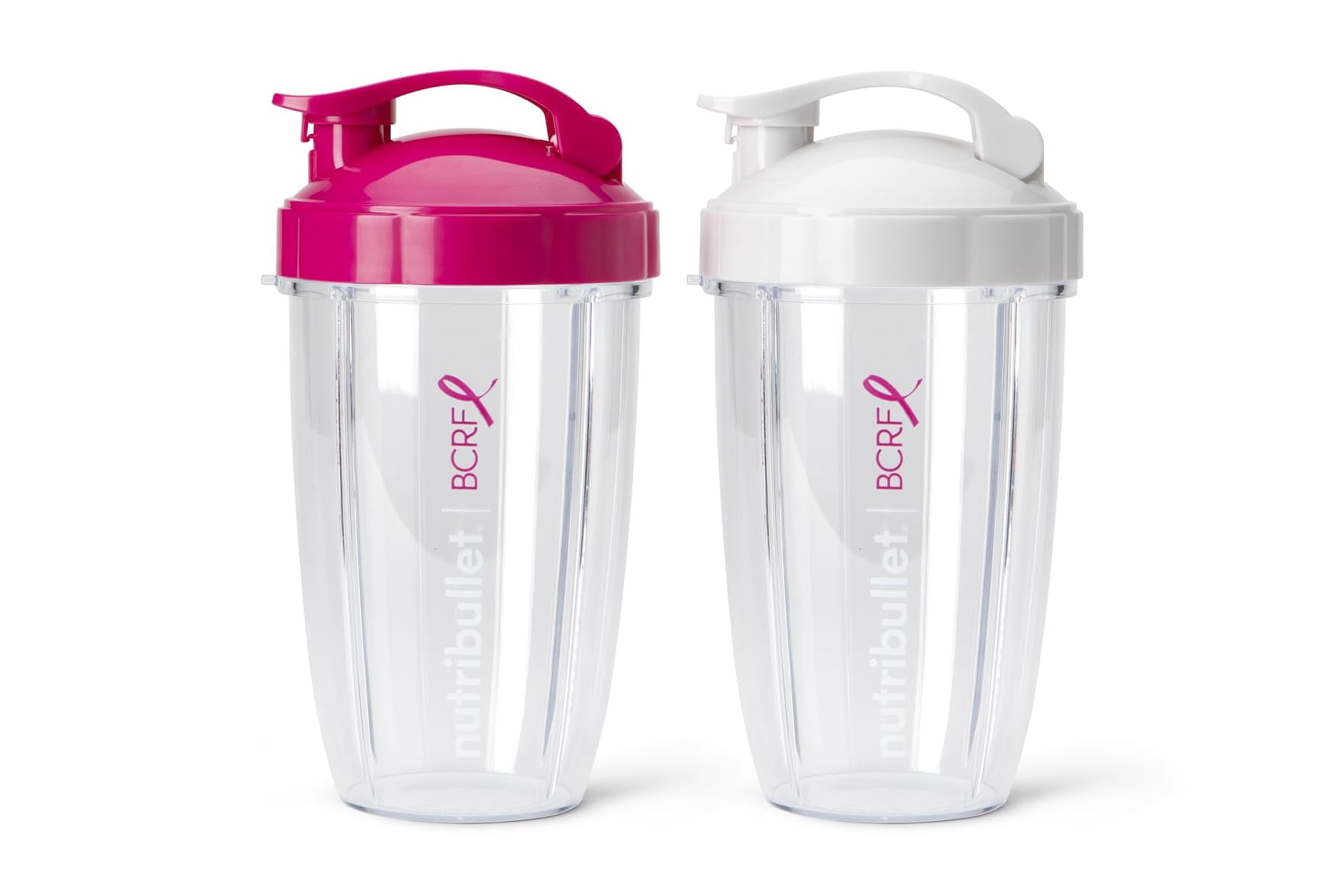 Set de dos vasos nutribullet de 700 ml con tapa abatible en colores rosa y blanco, diseñados para transportar tus bebidas con comodidad y estilo.
