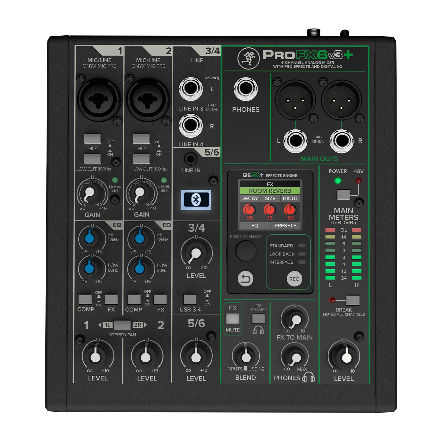 La mackie profx6v3 plus es un mezclador analógico profesional y una interfaz de audio usb-c con potentes mejoras para grabaciones y transmisiones en vivo con calidad de estudio. capture su interpretación con preamplificadores y ecualizador de canal onyx, agregue audio de computadora a través de loopback, reciba llamadas a través de bluetooth® y mejore su sonido con efectos gigfx+ actualizados en una pantalla lcd en color. con hasta 60 db de ganancia y ruido ultrabajo, los mezcladores de la serie profxv3+ le permiten sonar mejor que nunca. graba podcasts, transmite juegos o produce el próximo éxito, todo con audio transparente y ultralimpio. nuestros galardonados preamplificadores de micrófono onyx brindan calidez analógica para que suene excelente, sin importar lo que haga.