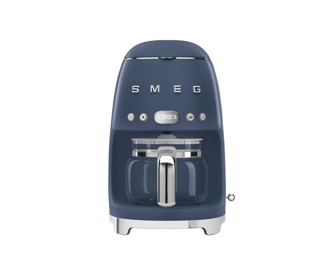 Cafetera de goteo smeg de estilo retro de los años 50 con jarra de vidrio para 10 tazas, función de arranque automático, plato para mantener caliente y dos ajustes de intensidad del café (azul marino)