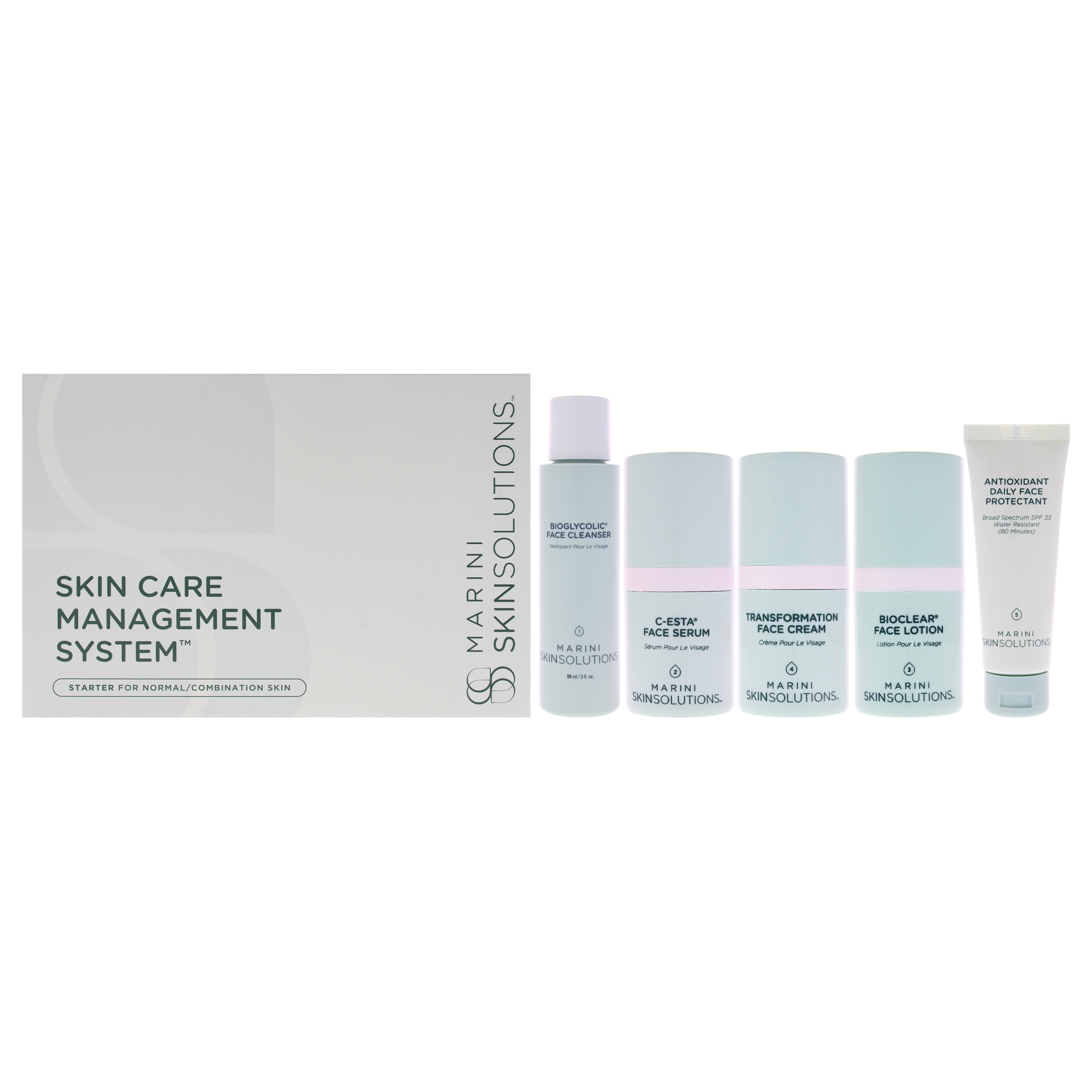 Sistema de cuidado de la piel para tipo normal a mixto de marini skinsolutions, compuesto por 5 piezas: limpiador facial bioglicólico 90ml, suero facial c-esta 15ml, loción facial bioglicólica bioclear 15ml, crema facial transfomation 15ml y protector facial diario antioxidante spf 33 30ml.