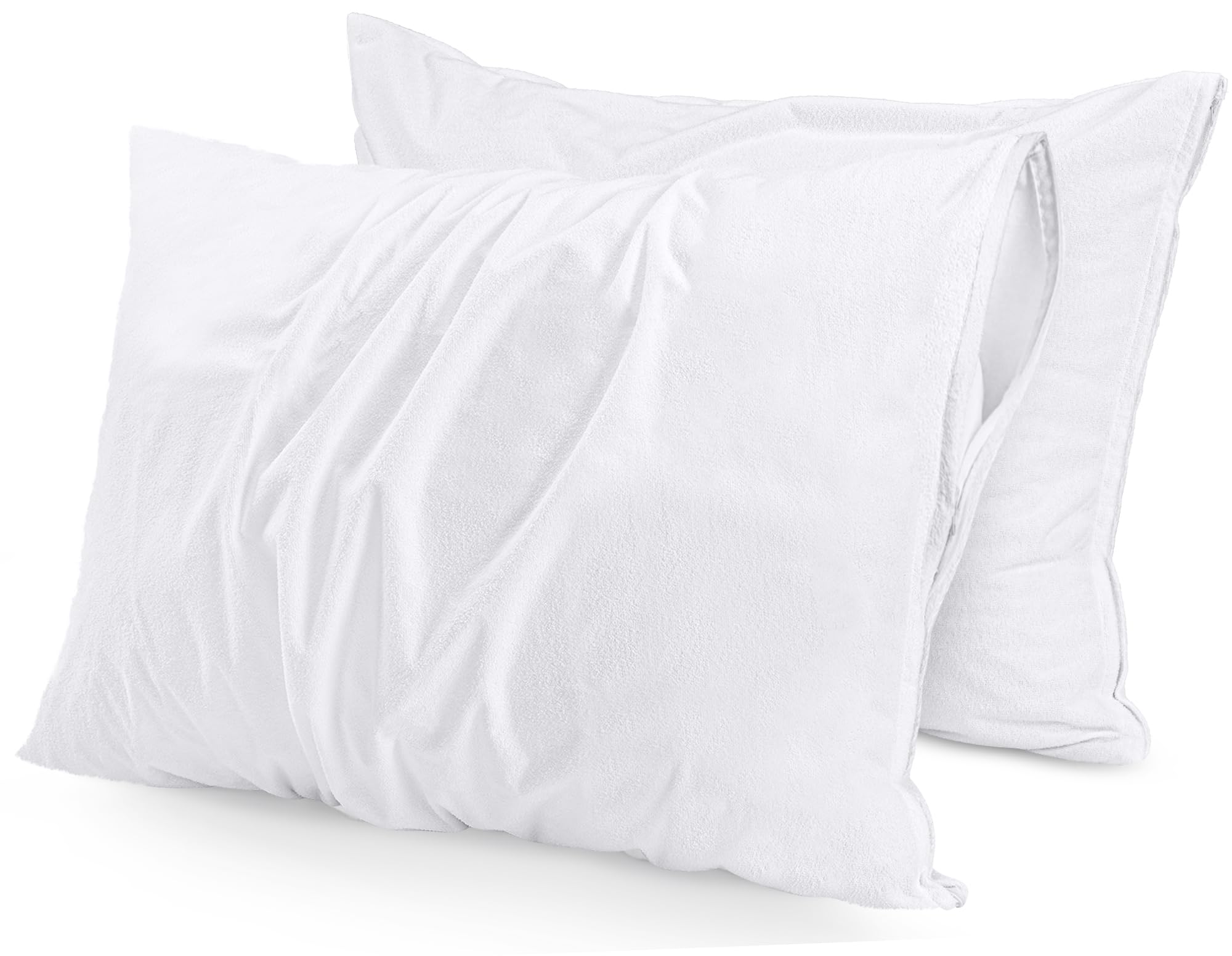 Utopia bedding protectores de almohada impermeables con cremallera, tamaño king (paquete de 2), fundas de almohada de rizo, a prueba de insectos y ácaros del polvo - protectores de almohada de rizo: nuestras fundas de almohada de rizo envuelven tus almohadas para mayor comodidad. están hechas de poliéster y se ajustan perfectamente a almohadas de tamaño king, miden 20 x 38 pulgadas cada una - tela de rizo de poliéster impermeable: el respaldo de tpu de alta calidad es una barrera impermeable que evita que el líquido pase y también resiste la sudoración, las manchas de líquidos, la saliva y la enuresis en la cama. son suaves, duraderos y silenciosos - cierre con cremallera: la cremallera de alta calidad y las costuras de doble dobladillo sellan las almohadas, evitando fugas y asegurando una experiencia de sueño higiénica y relajante, mientras que hace que sea fácil de poner y quitar - fácil cuidado: nuestras fundas de almohada son lavables a máquina, se pueden secar en secadora a baja temperatura para que se vean como nuevas después de cada lavado