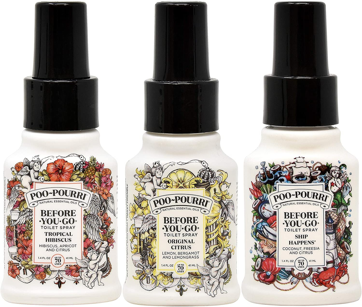 Set de ambientadores para baño poo-pourri con aromas original citrus, tropical hibiscus y ship happens, cada uno en presentación de 42 ml. fórmulas diseñadas para neutralizar olores y dejar un aroma fresco y agradable en el ambiente.