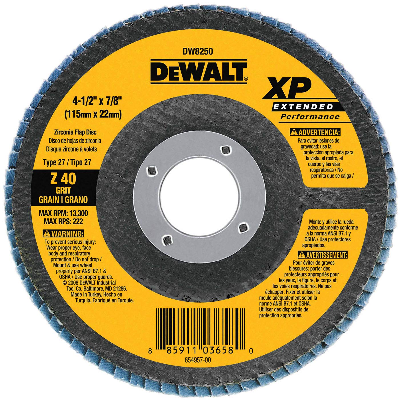 Dewalt dw8250 disco de solapa xp de 4 1 2 pulgadas por 7 8 pulgadas el producto es disco de solapa de 4 5" x 7 8" grano 40 tela de circonita premium acción de molienda y aplicación de acabado fácil de usar el producto se fabrica en china