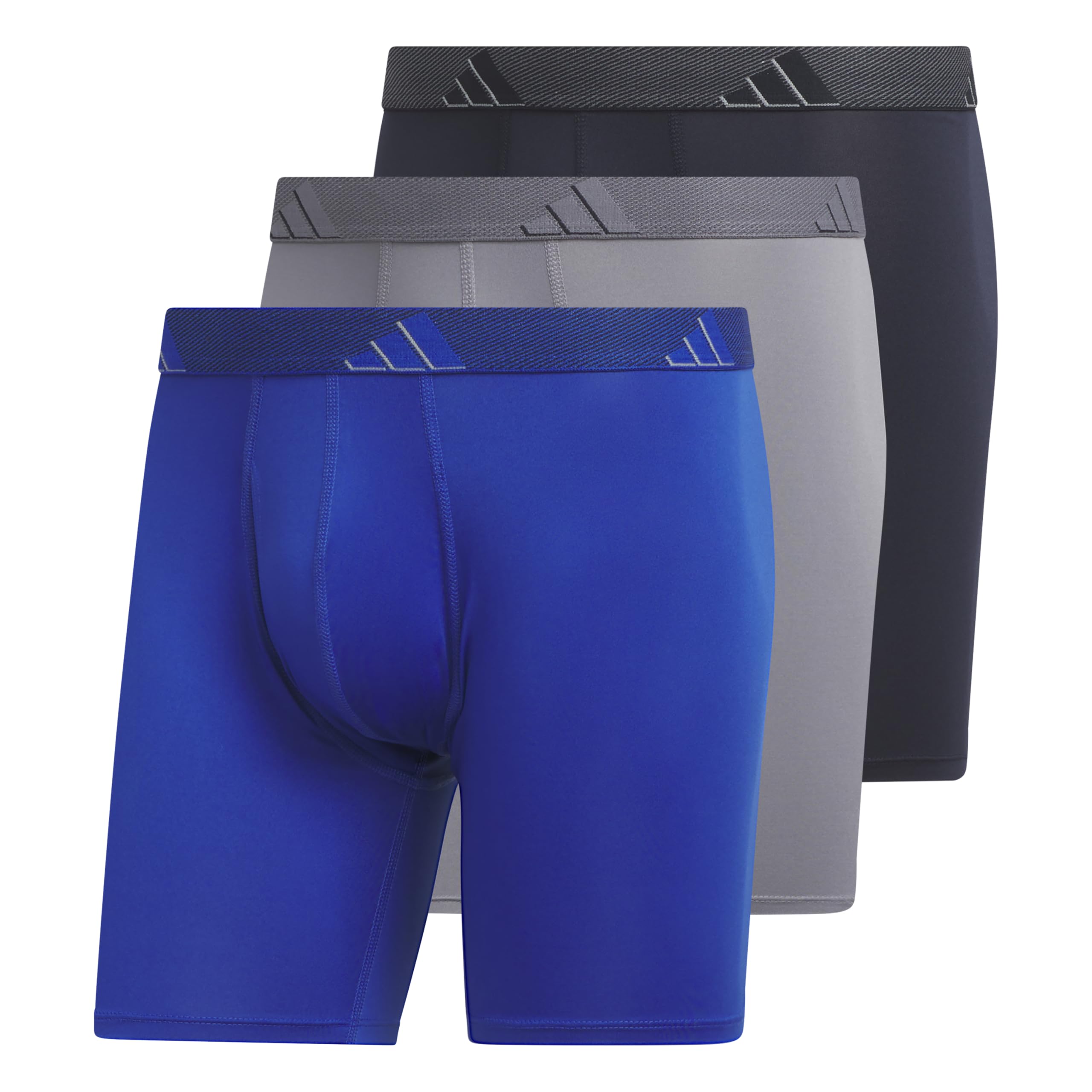 Adidas calzoncillos tipo bóxer performance para hombre (paquete de 3), team royal blue/gris/legend ink blue/microfibra - ajuste cómodo atlético: estos calzoncillos tipo bóxer tienen un ajuste cómodo que brinda apoyo sin ser demasiado apretados o restringir el movimiento. - mantente cómodo: el ajuste suave y elástico de la tela de secado rápido que absorbe la humedad te ayuda a mantenerte seco y fresco. - cintura sin etiquetas: la cintura de felpa sin etiqueta y las costuras suaves ayudan a limitar la irritación para una comodidad duradera y superior. - elimina el amontonamiento: una construcción de pierna que no se sube, mantiene el amontonamiento al mínimo mientras mantiene un ajuste consistente. - mosca funcional: la construcción ergonómica de solapa lateral facilita el acceso y las costuras mínimas.