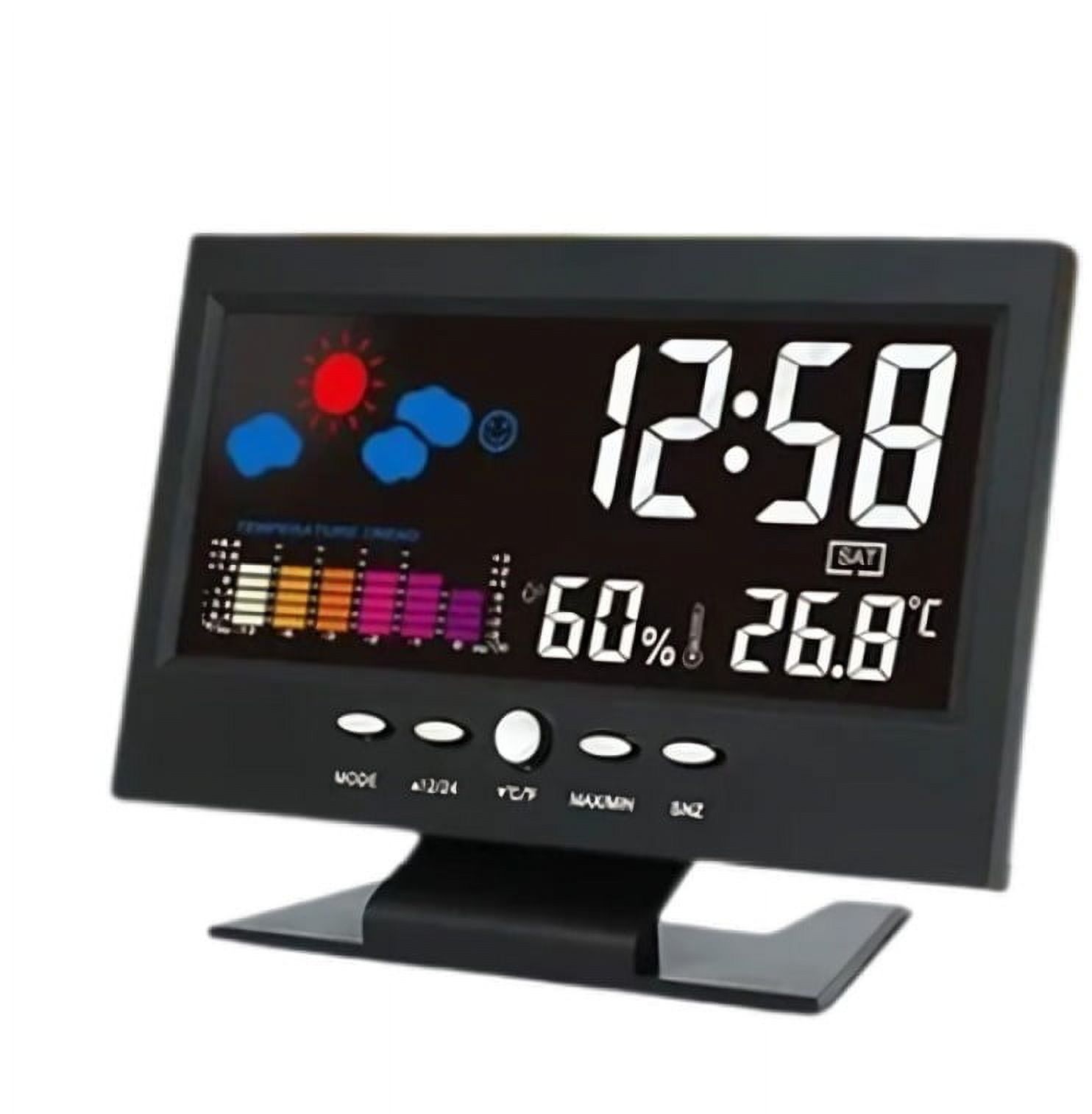 Pantalla lcd a color digital usb temperatura humedad tiempo indicador de fecha alarma reloj especificaciones: despertador con función de repetición. con función de pronóstico del tiempo de color. función de calendario y reloj: visualización de hora, minuto, fecha, mes, semana y sistema de 12/24 horas. muestra la temperatura en grados fahrenheit y celsius. con función de interruptor de temperatura fahrenheit y celsius. la retroiluminación es brillante y hace que la pantalla sea fácil de leer con poca luz cuando se activa. reloj de diseño moderno adecuado para su dormitorio o alrededor de la casa y la oficina. nombre del artículo: termómetro despertador material: de plástico fuente de alimentación: 2 pilas aaa (no incluidas) características: función de calendario/reloj, digital, termómetro de despertador, fácil de leer tamaño: 15,4 cm x 11,8 cm x 3,7 cm/6,06 "x 4,65" x 1,45