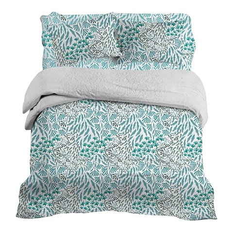 Doral - Plumón Sherpa + Sábana Microfibra 1.5 Plazas Blanco Hojas Azul Amarillo