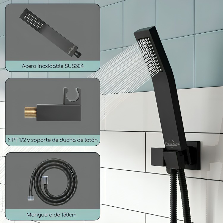 El set de plato de ducha, ducha teléfono y monomando empotrado rectangular te ofrece una experiencia de baño de lujo. con un diseño moderno y elegante, haz de tu baño una gran experiencia especificaciones del producto: material: latón, acero inoxidable 304. tamaño: 248mm cabeza de ducha cuadrada fija; cabezal de ducha de mano 202mm estilo: montado en la pared. acabado: negro mate. el paquete contiene: 1 cabezal de ducha de lluvia de 248mm control de válvula mezclador de ducha 1x1 (contiene equilibrador de presión) 1 cabezal de ducha de mano de latón. 1 manguera de ducha de acero inoxidable 304 de 150cm 1 brazo de ducha de metal 1 soporte de ducha de latón