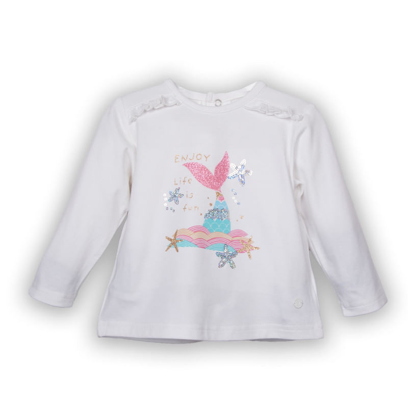 Polera manga larga para bebe niña con estampado frontal y vuelos decorativos en hombro
