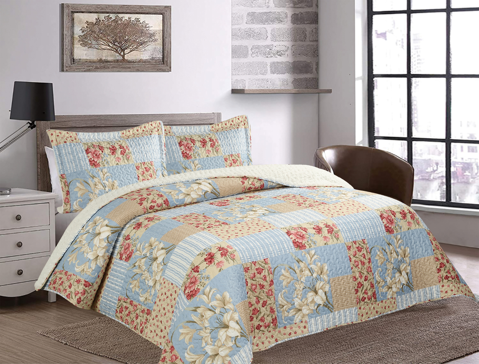 Chantilly - Quilt Patchwork Sherpa 1.5P Azul Flora | Lider Electrohogar
