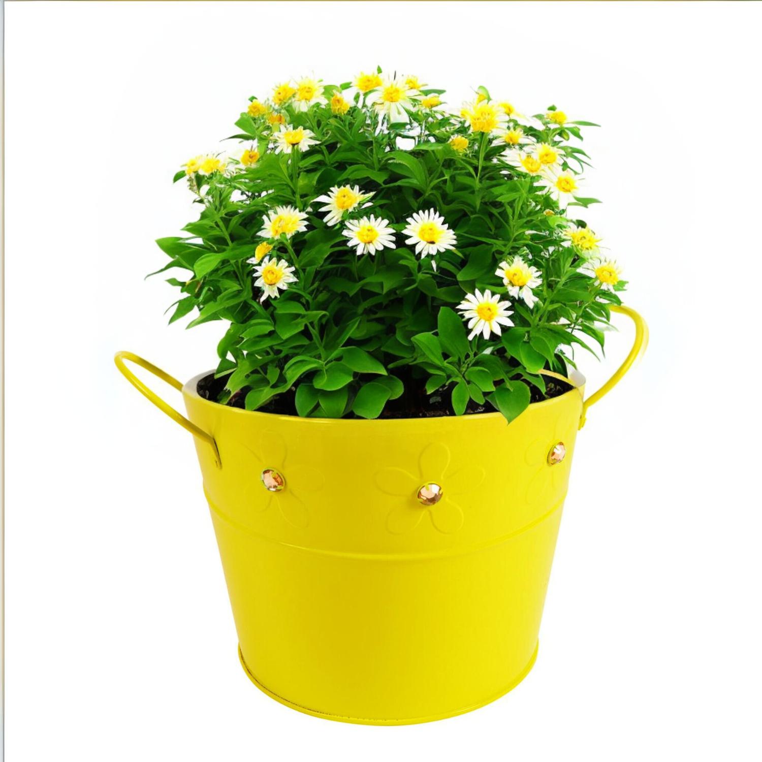 Balde de metal color amarillo de 15 cm de alto x 18 cm de largo x 22 cm de ancho. ideal para organizar todo en tu escritorio, baño, cocina, etc. además, por su diseño versátil también puedes utilizarlos en jardinería como macetas para tus plantas. decora y da vida a tus espacios con nuestra línea de decoración sohogar. marca: sohogar color: amarillo material: metal recomendado para usar como macetero medidas:15,5 cm x 18 cm x 18 cm