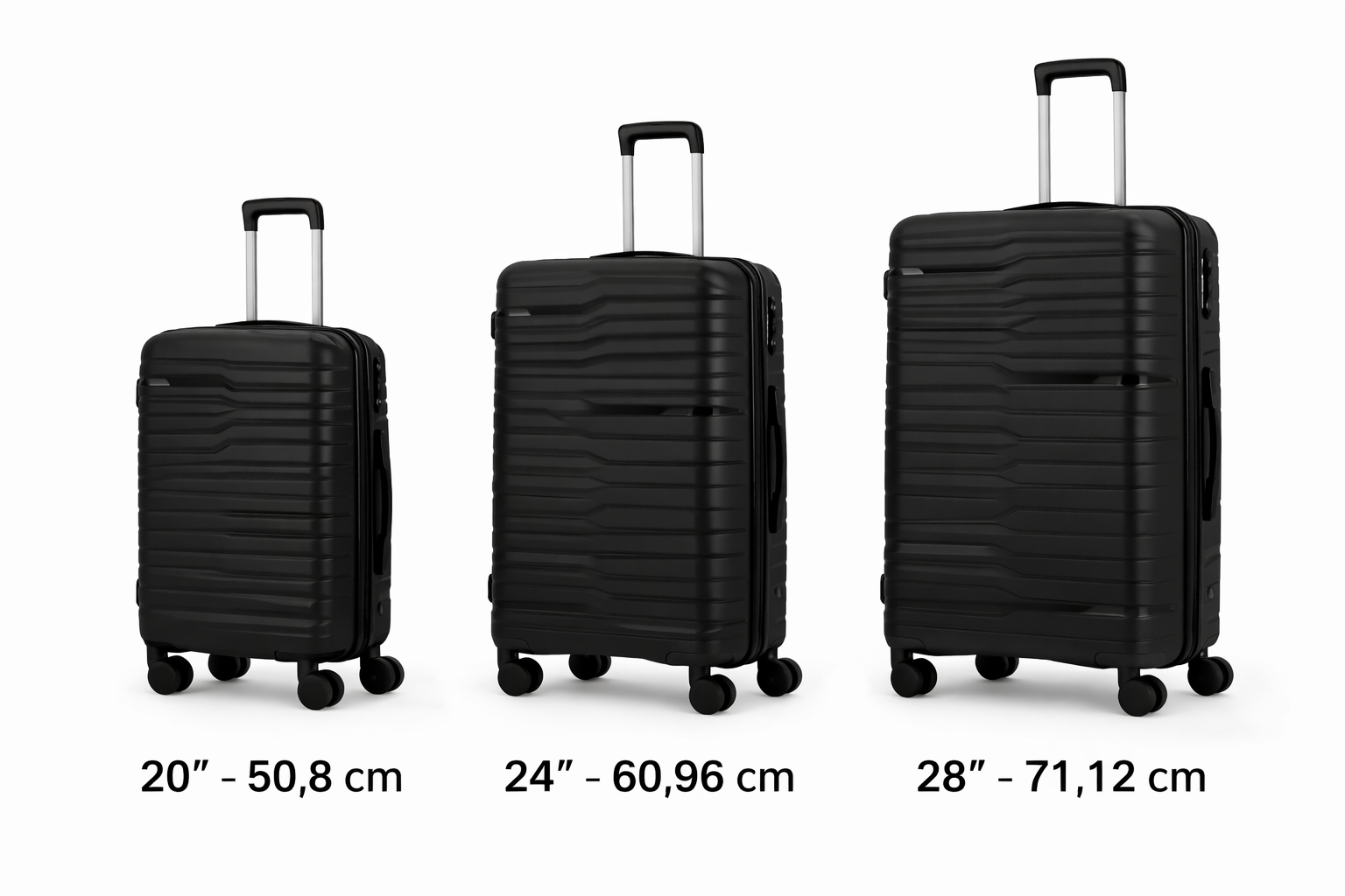 Juego de maletas rígidas negra, fabricadas en pp de alta resistencia. incluye 3 tamaños (20”, 24”, 28”), ruedas silenciosas 360°, trolley de hierro reforzado, manillas superior y lateral y cerradura de combinación. seguras, duraderas y listas para cualquier viaje.