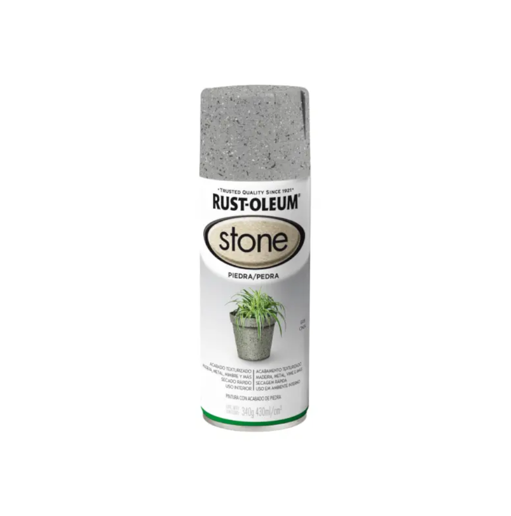 La pintura stone rust-oleum gris texturizado transforma tus superficies con un acabado decorativo que imita la piedra real. su fórmula en aerosol permite una aplicación sencilla en proyectos de interiores, ideal para madera, metal y cerámica.