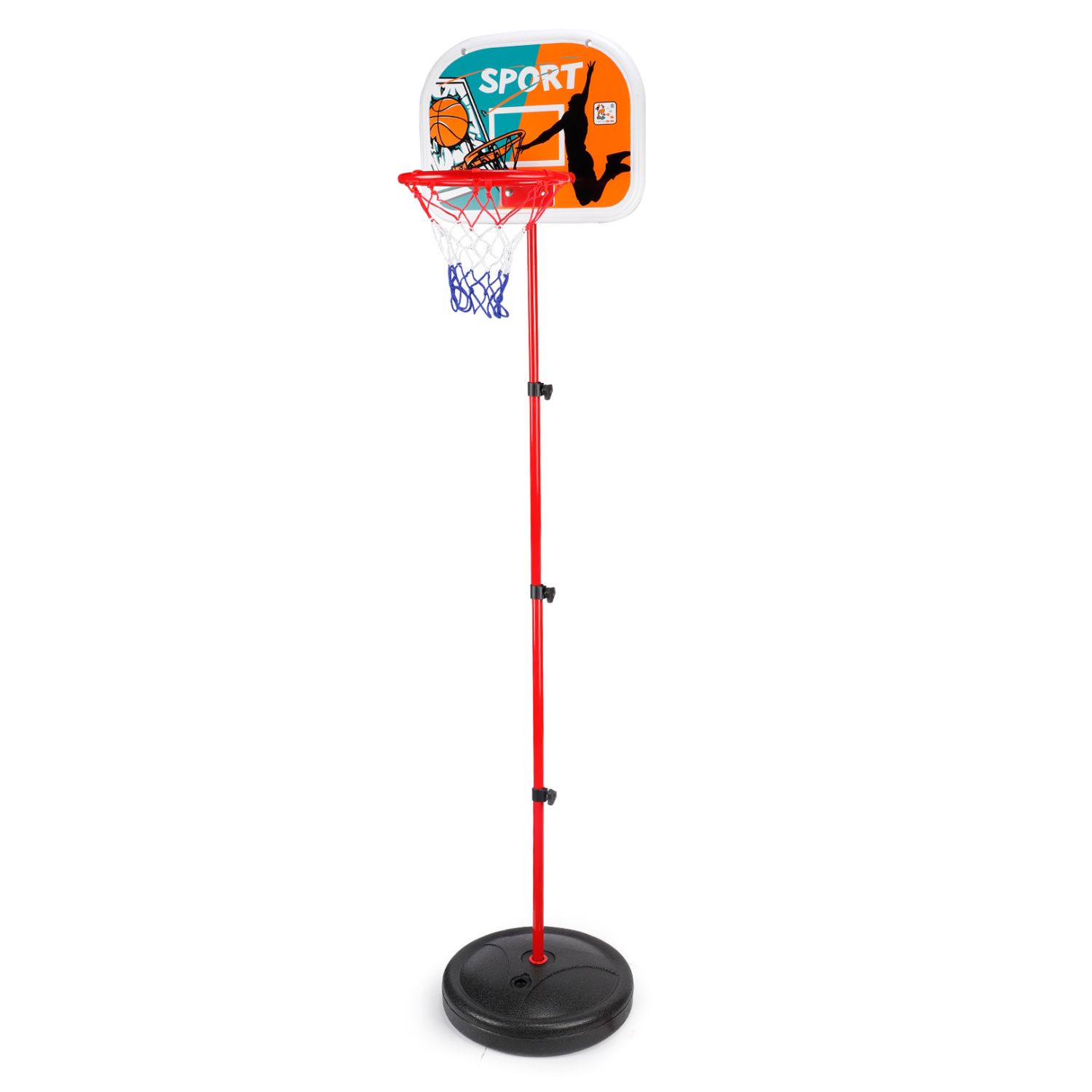 Aro de baloncesto fácil a armar se puede jugar en adentro o al aire libre. es de instalación fácil y con altura ajustable. además, incluye una pelota y bombín. altura máxima 200 cm base de plástico que se puede llenar con arena o agua. altura regulable. medidas:200 cm x 48 cm x 48 cm incluye: 1 x respaldo 46.5cm de largo y 32.5 cm de alto. 1x base 1 x aro 1 x balon 1 x inflador 1x malla