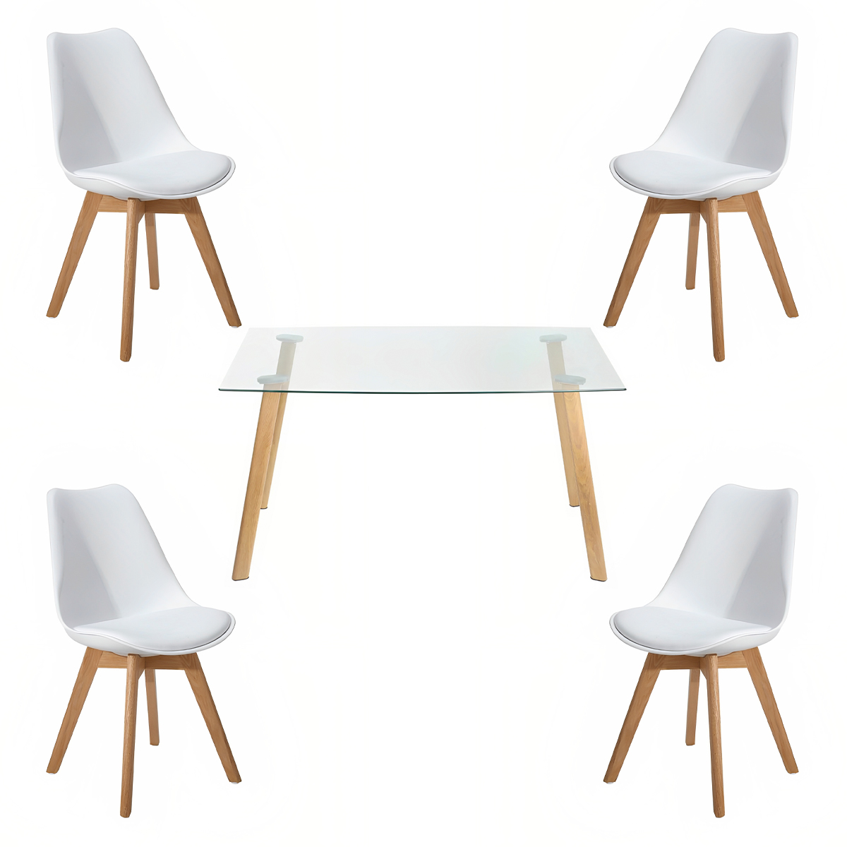 Comedor Mesa de Vidrio Nórdica 140x90 cm + 4 Sillas Tulip Blancas