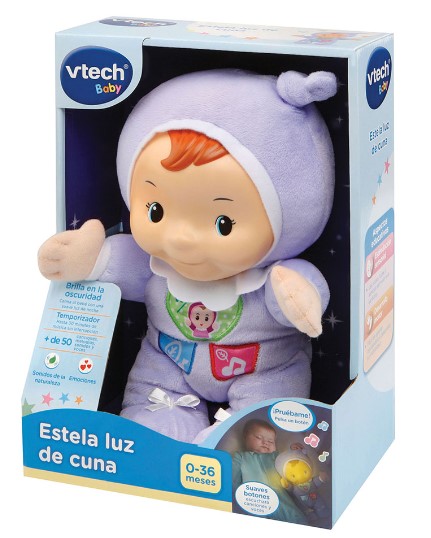 Estela luz de cuna es una entrañable muñeca musical con voz y luz. su rostro luminoso tranquiliza al bebé antes de dormir. tiene tres botones para reproducir canciones, melodías, frases y sonidos de la naturaleza y ayudar al niño a conciliar el sueño. botón corazón ; activa canciones, melodías y frases, sonidos de la naturaleza ; sonidos para conciliar el sueño ; música, melodías sin interrupción. contiene 40 melodías, 2 canciones y temporizador de tiempo (15 ó 30 minutos) para escuchar música sin interrupción. estimulación sensorial, las voces, luces y sonidos estimulan sus sentidos. desarrollo motor, fácil de agarrar ayudándole a desarrollar su motricidad. funciona con 2 pilas aa incluidas. se recomienda de 0 - 36 meses.