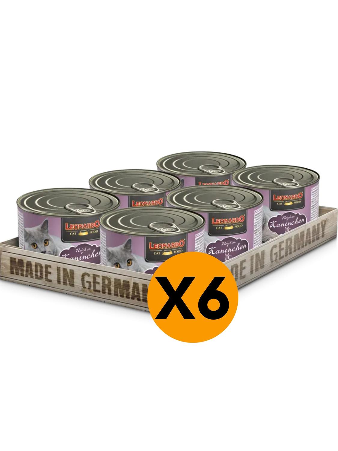 Packs 6 unidadesleonardo® quality selection kaninchen es un alimento húmedo en lata indicado para gatos adultos rico en conejo. en su fórmula solamente se utilizan productos cárnicos frescos. gracias a la alta disponibilidad biológica y a la alta calidad de estos productos, su gato necesita una cantidad relativamente pequeña para satisfacer sus necesidades nutricionales diarias. latas de 200 y 400 g. hecho en alemania.garantizado con los mejores ingredientes.excelente sabor y tolerabilidad.productos cárnicos solo procedentes de animales aptos para el consumo humano.con carne fresca.encantados de prescindir de:ensayos en animales.proteínas de soja.colorantes artificiales, potenciadores de sabor y conservantes.ingredientes:carne y derivados animales (65 %, de los cuales 25 % conejo, + caldo de carne 34 %); minerales (1 %).