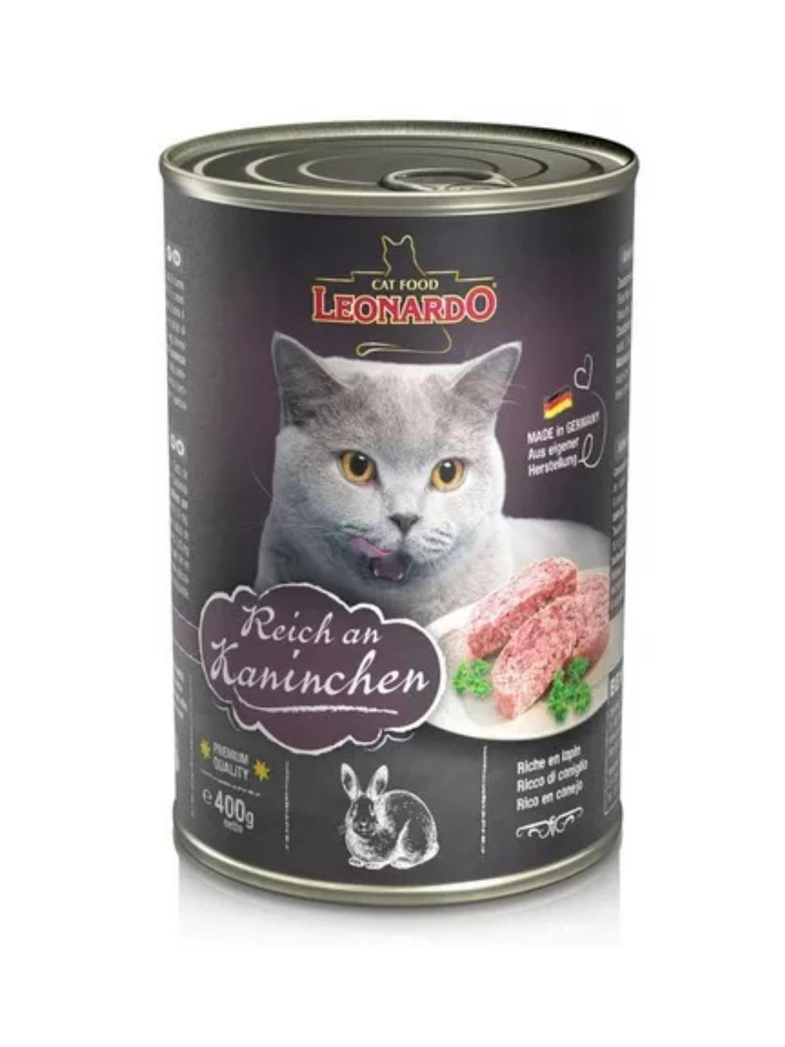 Alimento leonardo sabor conejo - lata 400g descripción calidad al gusto de tu gato los gatos, al igual que los felinos que viven en el medio natural, son carnívoros. por eso solo utilizamos productos cárnicos frescos. las latas leonardo quality selection reich an kaninchen están hechas a base de carne fresca de ave y conejo, y corresponden a una dieta completa y balanceada para gatos adultos. recomendaciones de alimentación dar 200 a 400 g diarios para gatos entre 3-5 kg, o reemplazar cada 25 g de alimento seco por 100 g de alimento húmedo. administrar a temperatura ambiente. asegúrese de que el animal disponga de agua fresca en todo momento. una vez abierto, mantener refrigerado en la lata por un máximo de 24 horas. análisis garantizado dieta completa para gatos adultos composición carnes y subproductos animales (65 %, de los cuales 25 % conejo, + caldo de carne 34 %); minerales (0,5 %); cáscaras de huevo, secas (0,5 %) análisis de los componentes proteína 10,0 %; contenido de grasa 5,0 %; ceniza bruta 2,0 %; fibra bruta 0,3 %; humedad 80 %; calcio 0,3 %; fósforo 0,2 % aditivos por kg aditivos nutricionales: vitamina d3 200 ui; vitamina e 50 mg; manganeso (como sulfato de manganeso ii) 2 mg; zinc (como sulfato de zinc, monohidrato) 20 mg; yodo (como yodato cálcico, sin agua) 0,2 mg; taurina 1.000 mg; energía (me) 4,07 mj/kg; energía (me) 973 kcal/kg