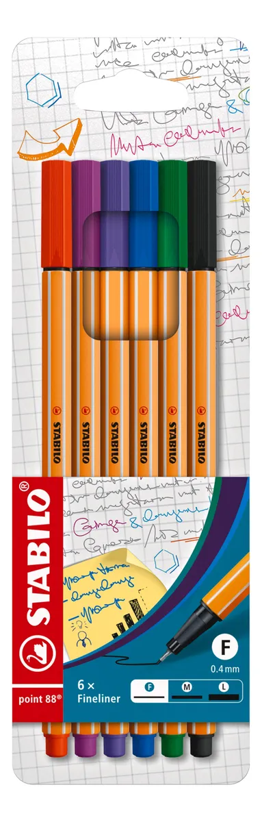 Set de 6 lápices stabilo point 88 en blister. es el lápiz ideal si quieres escribir, subrayar, delinear o dibujar, ¡soy el bolígrafo que buscas!. características 6 colores trazo de 0,4 mm punta metálica diseño hexagonal puede permanecer destapado hasta 3 horas punta de fieltro tinta a base de agua indicado para dibujos detallados, líneas precisas y escritura fina. la punta gruesa facilita el uso de plantillas y reglas. la punta metálica aumenta la durabilidad y la firmeza.