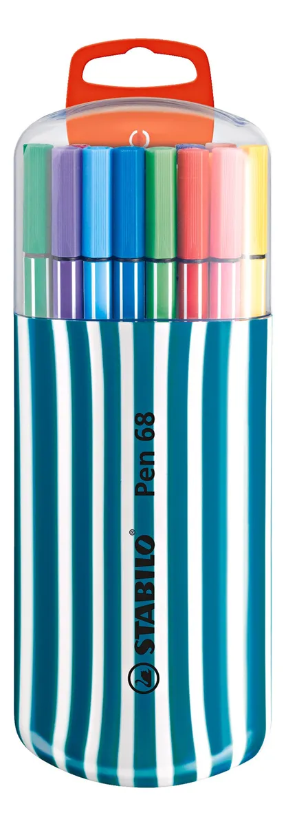 Set de 20 marcadores stabilo pen 68 zebrui estuche turquesa. el rotulador fue diseñado para potenciar tu creatividad y siempre tendrás los resultados esperados. tanto si eres un artista o simplemente te diviertes dibujando, este rotulador premium es para ti. características rotulador de alta calidad con punta de fibra para trazos fuertes y amplias zonas a colorear. pigmentos seleccionados con gran brillo y luminosidad. punta media (m) resistente (ancho de trazo 1 mm aprox.) para una aplicación de tinta uniforme. inodoro, con tinta al agua. tapa ventilado. hasta 24 horas destapado sin secarse. set contiene 20 marcadores pen 68 en hermosos colores. edición con estuche plástico rígido de gran calidad color turquesa con tapa transparente para que lleves tus pen 68 con gran estilo donde quieras. modelo: 6820-02-2-01 además, utilizando un pincel y un poco de agua se pueden realizar acuarelas.