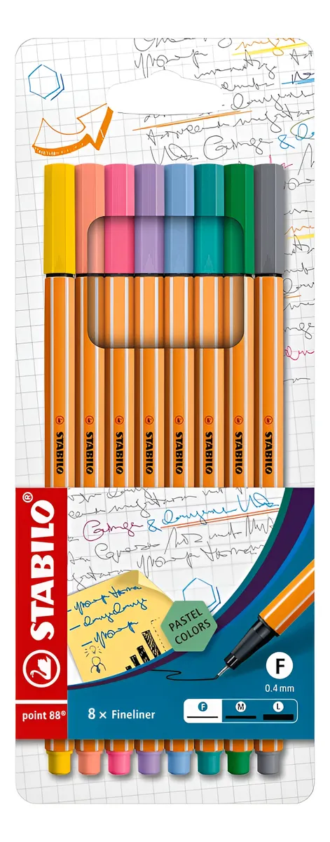 Estuche wallet de 8 rotuladores stabilo point 88 pastel. rotulador punta fina nº1 en europa reconocible a primera vista, el rotulador stabilo point 88 ha sido un referente en el campo de la escritura desde su lanzamiento en 1977. ya sea para escribir, dibujar o subrayar, y con una amplia gama de colores, este rotulador puede satisfacer todas tus necesidades diarias. características del producto disponible en varios colores. trazo de 0,4 mm para una escritura más precisa. punta metálica reforzada para mayor resistencia. ideal para crear dibujos muy detallados o para una escritura precisa. perfecto para usar con escuadras y reglas. ideal para trabajos de precisión, tomar notas y dibujar.