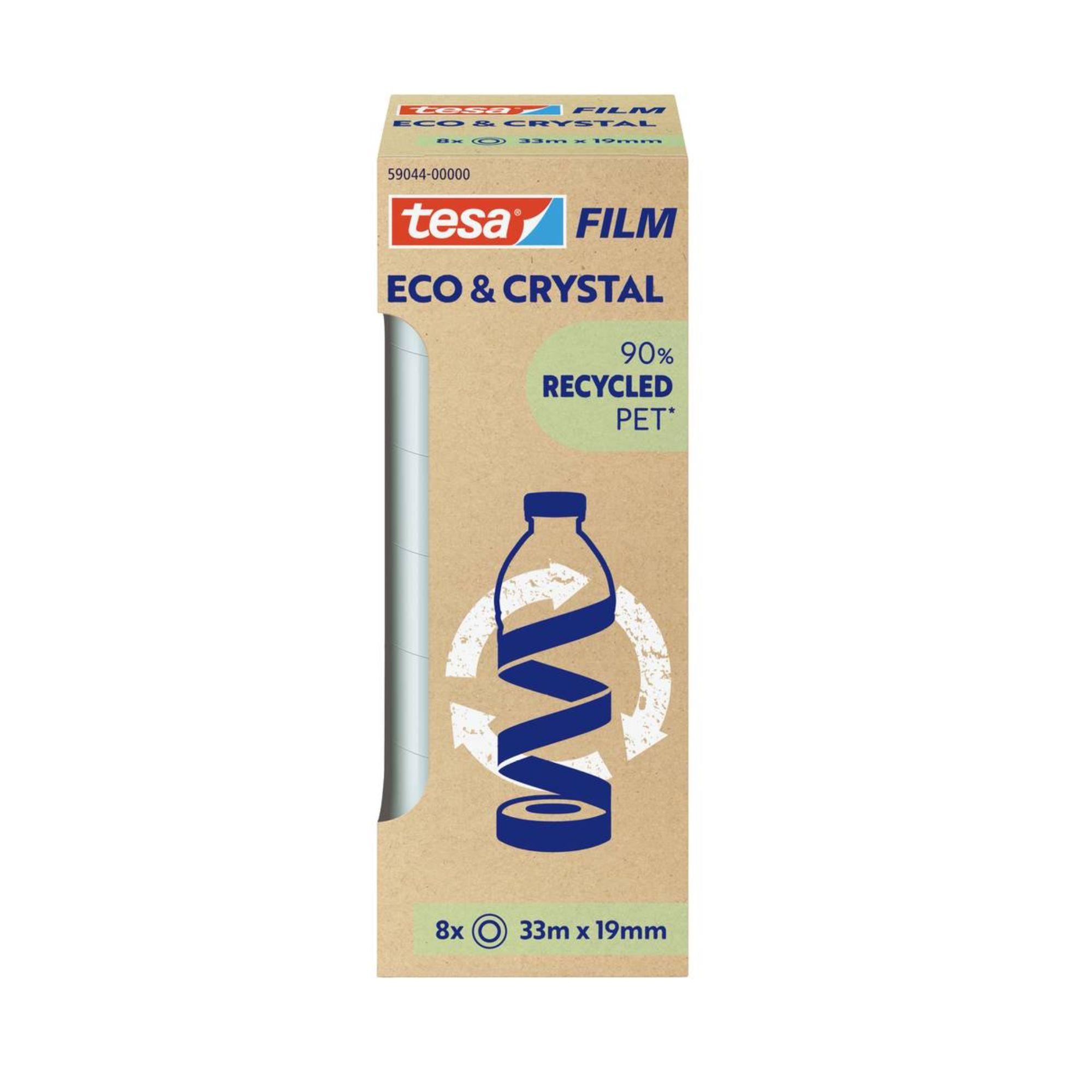 Cinta adhesiva eco & crystal torre 19mm x 33mts 8un - tesa. presentamos la tesafilm® eco & crystal, una cinta que combina los atributos conocidos de una tesafilm® clásica con una aportación ecológica. altamente transparente, versátil, con un fuerte adhesivo sin disolventes y un material de soporte fabricado con un 90 % de botellas de pet recicladas. perfecta para unir, embalar, fijar, decorar y reparar. el núcleo del rollo también está fabricado al 100 % con plástico reciclado..