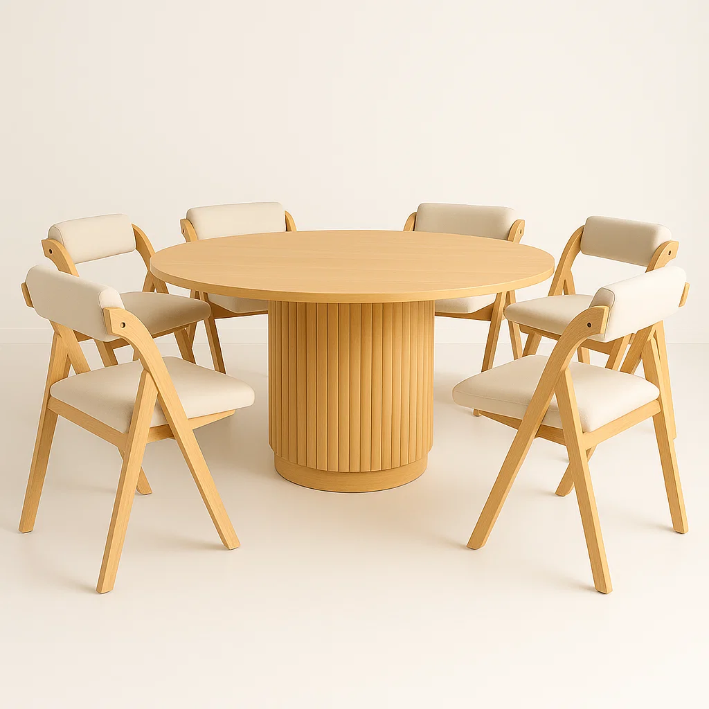 Klik Muebles - Comedor Mesa Redonda Nórdica Armonía De 130 Cm Madera Natural + 6 Silla Betlahem De Madera Plegable Acolchada - Beige | Lider Electrohogar