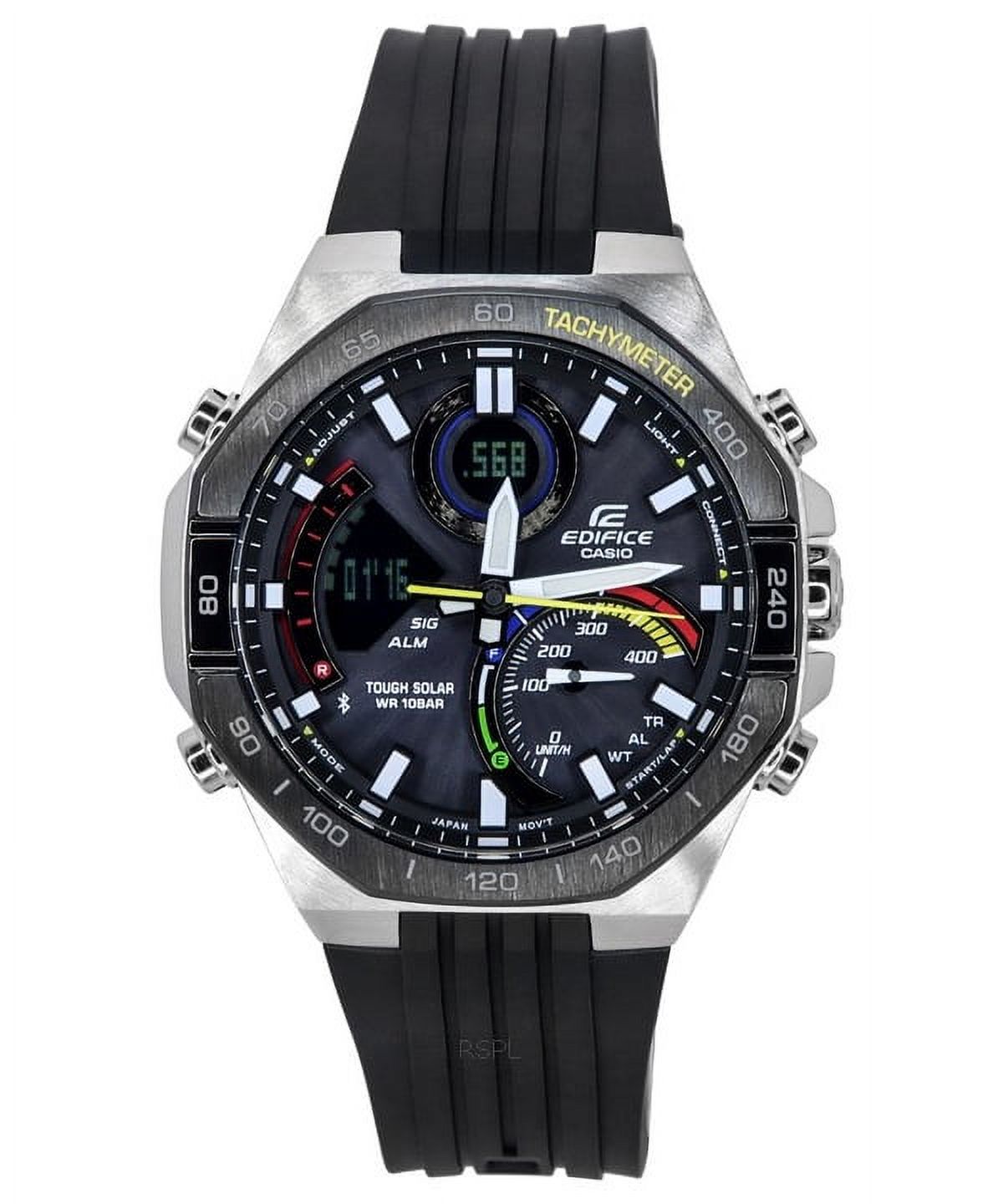 El casio edifice ecb-950mp-1a es un reloj digital y analógico para hombre con esfera negra y detalles multicolores. cuenta con tecnología tough solar que garantiza un rendimiento confiable y ecológico. su función mobile link permite sincronizar el reloj con tu smartphone para mayor precisión. resistente al agua hasta 100 metros, es ideal para uso diario y actividades al aire libre. incluye escala taquimétrica, hora mundial, cronómetro y cinco alarmas multifunción para una experiencia completa.