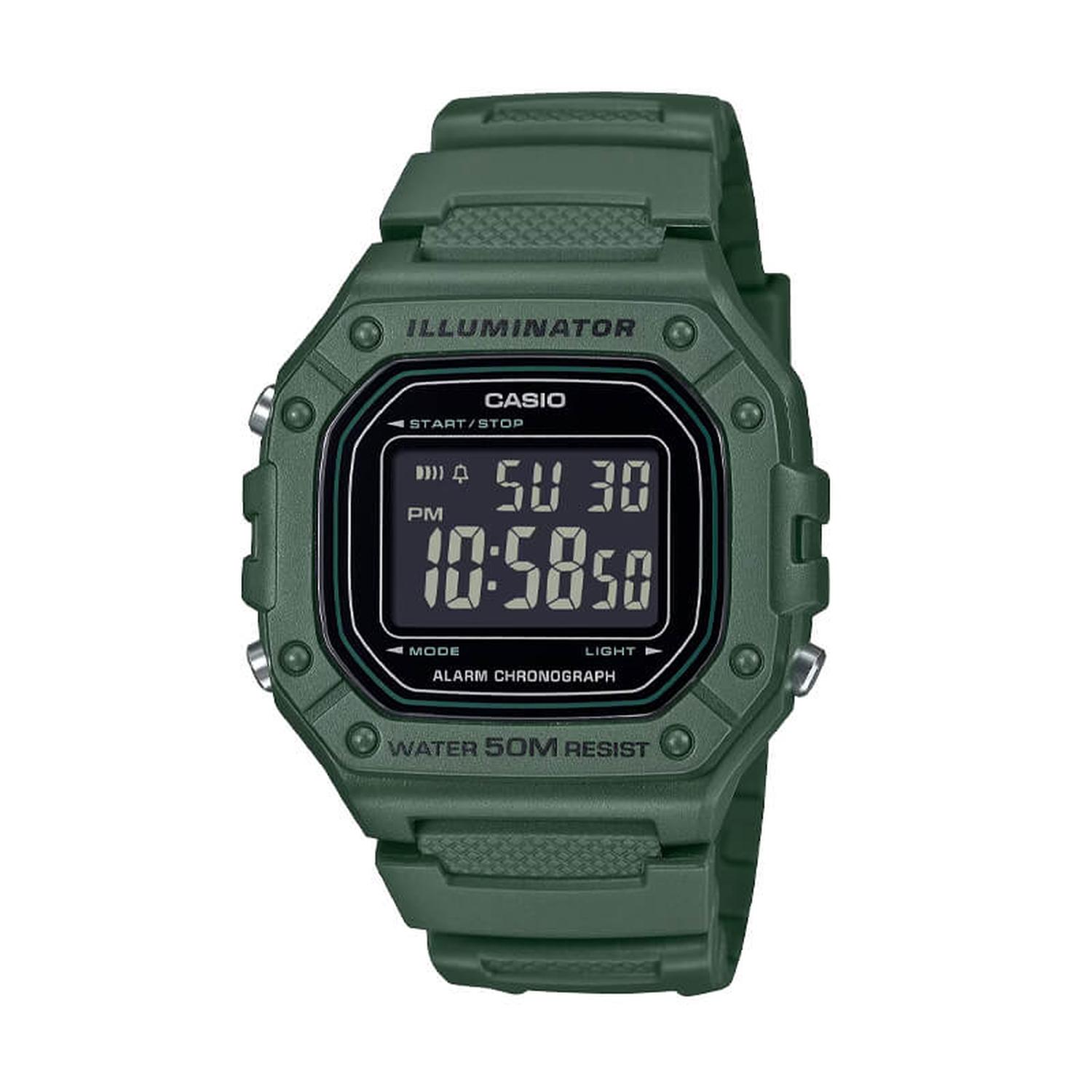 El casio w-218h-3bvdf presenta una caja de resina en tono verde militar con diseño cuadrado y bisel robusto, que le da un aire deportivo y resistente. su correa de resina ajustable combina comodidad y durabilidad, mientras que la pantalla digital amplia asegura una lectura clara en todo momento. este modelo cuenta con cronómetro, alarma diaria, calendario automático y luz led. con resistencia al agua de 50 metros, es ideal para actividades al aire libre o uso urbano, pensado para quienes buscan un estilo casual y práctico. reloj digital casio verde militar