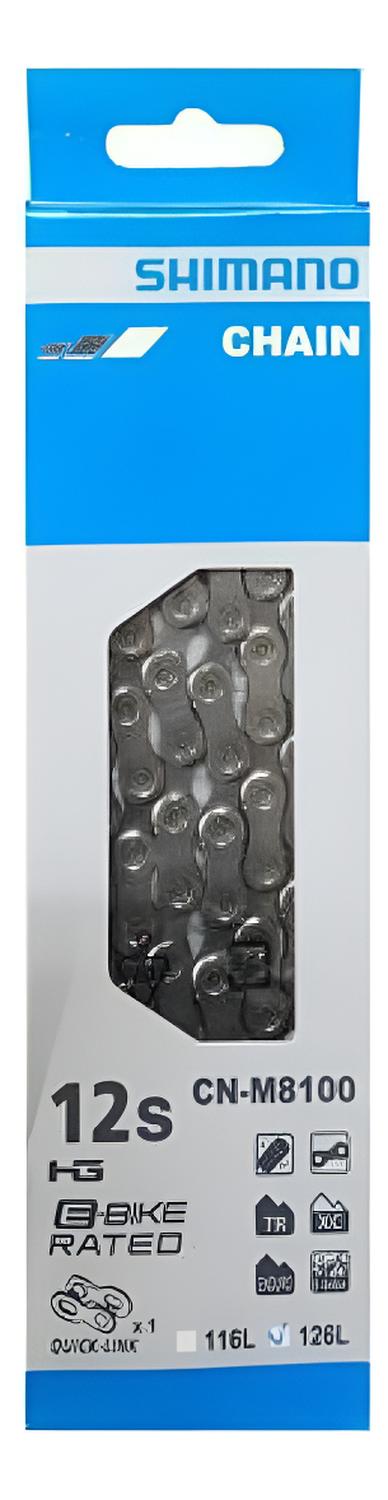 La cadena shimano m8100 de la línea deore xt, mejora la retención de la cadena, gracias a una parte extendida de la placa interior. la nueva cadena está equipada con montaje rápido de eslabones y tratamiento sil-tec para una mayor durabilidad en montaña. su diseño exclusivo garantiza cambios suaves y fortaleza, ya que incluye la tecnología hyperglide de shimano, que hace mucho más fácil el cambio de marchas, además la placa interior extendida mejora el acoplamiento y la retención de la cadena caracteristicas: - la tecnología hg tiene chapas interiores biseladas para optimizar el cambio de marchas en los piñones. - durabilidad garantizada gracias al tratamiento de cromado en los pasadores de los eslabones y al tratamiento térmico de las placas de los rodillos. especificaciones: - uso: mtb - modelo: cn-m8100 - cantidad eslabones: 126 - compatible con: transmisión de 12 velocidades - peso: 255 gr **¿necesitas factura? una vez echa la compra envíanos un mensaje con los datos del receptor y te la haremos llegar a la brevedad.