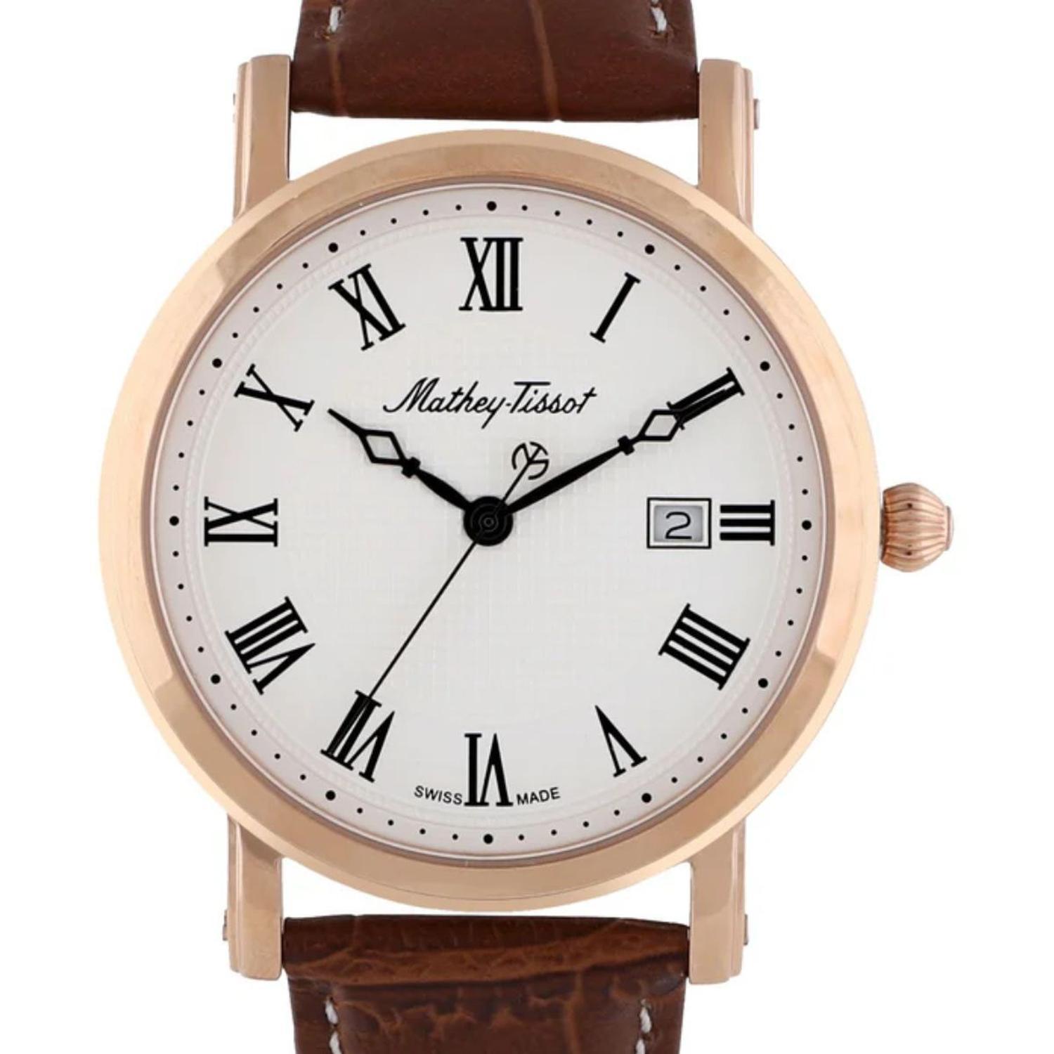 Mathey-tissot es una marca suiza reconocida por sus relojes de alta calidad y diseño elegante. fundada en 1886, combina tradición y modernidad en cada pieza. sus relojes destacan por la precisión de sus mecanismos, muchos de los cuales son automáticos, y por la atención al detalle en la manufactura. la colección abarca desde modelos clásicos hasta deportivos, todos con materiales premium como acero inoxidable y piel genuina. además, los diseños incluyen esferas elaboradas, detalles brillantes y funciones útiles, como cronógrafos y resistencia al agua. mathey-tissot ofrece una fusión perfecta de estilo y funcionalidad para los amantes de la relojería. genero: unisex tipo de maquinaria: cuarzo nombre de maquinaria: ronda 505 funciones: fecha diametro: 38mm material de caja: acero inoxidable 316l color de la caja: oro rosa cristal: recubierto de zafiro tapa trasera: acero inoxidable 316l corona: tirar / empujar resistencia al agua: 5 atm tipo de bisel: fijo color del bisel: oro rosa espesor: 8 mm color esfera: blanco ancho terminal: 20 mm material correa: cuero color correa: marron