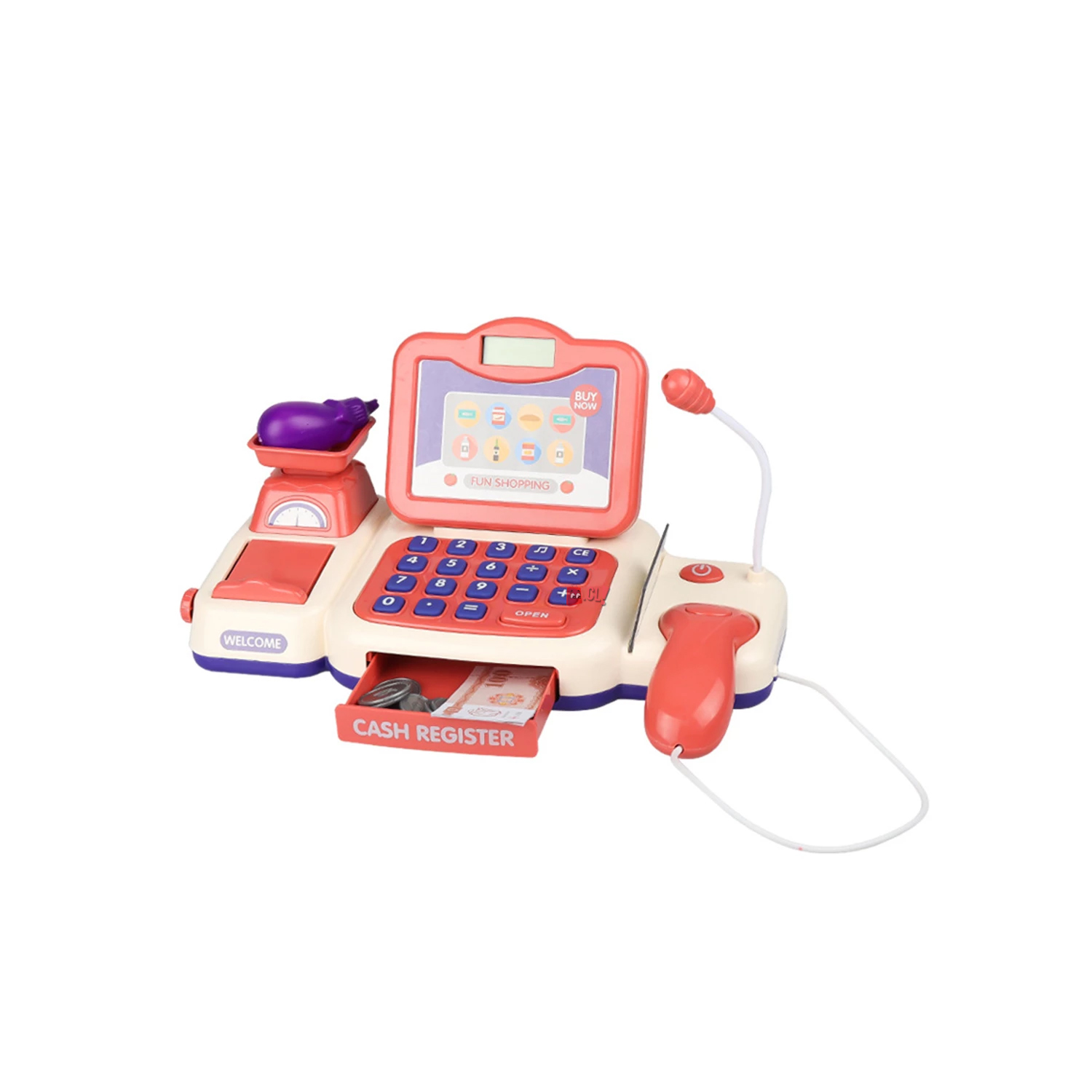 - color: rosado - material: plástico - dimensiones del producto: 28x13x14cm - peso del producto: 750g contenido del paquete: . 1 x caja registradora . 1 x zanahoria . 1 x calabaza amarga . 1 x berenjena . 1 x maíz . 1 x cesta de la compra . 3 x botella de condimento . 2 bebidas . 1 juego x billetes . 1 juego x monedas