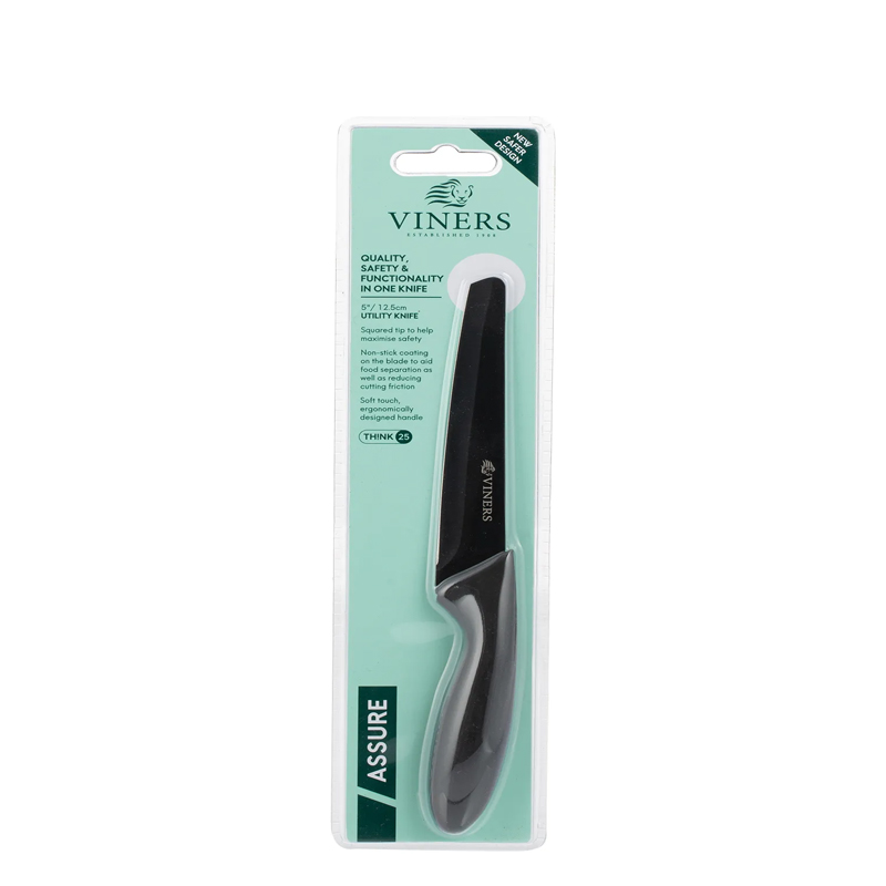 Cocine con seguridad y rendimiento asegurados. el assure utility knife tiene una hoja elegante diseñada para ser segura de usar dentro de la casa. esté a la vanguardia de la próxima generación de cuchillos de cocina. con su punta cuadrada, esta navaja está diseñada para ser más segura de usar. quitar la punta puntiaguda reduce el riesgo de accidentes sin comprometer el rendimiento. el cuchillo tiene un mango suave al tacto para un agarre cómodo. la hoja de acero inoxidable está templada para mantener los bordes afilados y tiene un revestimiento antiadherente que reduce la fricción durante el corte. es ideal para realizar tareas demasiado grandes para un corte y demasiado pequeñas para un cuchillo de chef. lavar a mano únicamente. la gama assure está diseñada teniendo en cuenta la seguridad y la funcionalidad, lo que garantiza que no se comprometa el rendimiento y el estilo. viners existe desde hace más de 110 años y se ha convertido en una marca británica muy querida y un nombre familiar, impregnado de herencia.