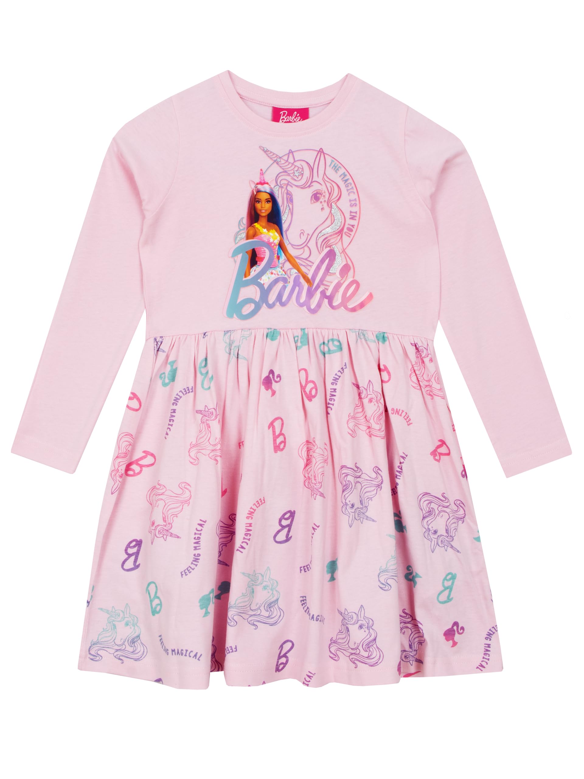 Mejora el armario de tu hijo con nuestro cautivador vestido de barbie rosa claro para niñas. este encantador vestido de unicornio combina comodidad, estilo y el encantador mundo de barbie. hecho de 100% algodón, el vestido ofrece un estilo moderno y una comodidad inigualable. con cuello redondo y mangas largas, es una excelente opción para cualquier temporada. como mercancía oficial de barbie este vestido abre un mundo de coloridos unicornios y creatividad ilimitada para tu hijo. es una opción ideal para ocasiones especiales como cumpleaños y navidad, por lo que es un regalo perfecto para niñas. ya sea disfrutando de una noche de cine en barbie o una cita de juego con muñecas barbie dolls, este vestido de falda patinadora es una fabulosa adición a su colección barbie .. - exclusivo vestido de unicornio de barbie - este vestido para niñas es un lienzo mágico, mostrando un hermoso unicornio de arte de línea turquesa y rosa. la melena del unicornio está adornada con plata metálica, añadiendo un toque caprichoso al armario de tu hijo. sobre esta hermosa ilustración, las inspiradoras palabras "la magia está en ti" recuerdan a tu pequeño su potencial ilimitado - fabuloso regalo de halloween: el vestido rosa perfecto para tu niña amante de barbie. combínalo con muñecas barbie para el mejor regalo de cumpleaños o navidad - logotipo oficial de barbie - el icónico logotipo de barbie se muestra de manera destacada debajo del gráfico, lo que significa que este vestido es una mercancía oficial de barbie que celebra el amor de tu hijo por esta muñeca clásica - vestido brillante de moda y divertido para niñas: adornado con un patrón divertido con el logotipo de barbie y un unicornio y la frase "sensación de magia", este vestido rosa para niños combina fantasía y estilo, mejorando la colección de ropa barbie de tu niña - estilo versátil: ideal para una variedad de ocasiones, este vestido de unicornio rosa claro es una adición elegante y adaptable al armario de barbie de tu hijo. perfecto para un día casual, una fiesta de cumpleaños o un día jugando con muñecas de barbie este vestido seguramente complementará el estilo único de tu hijo