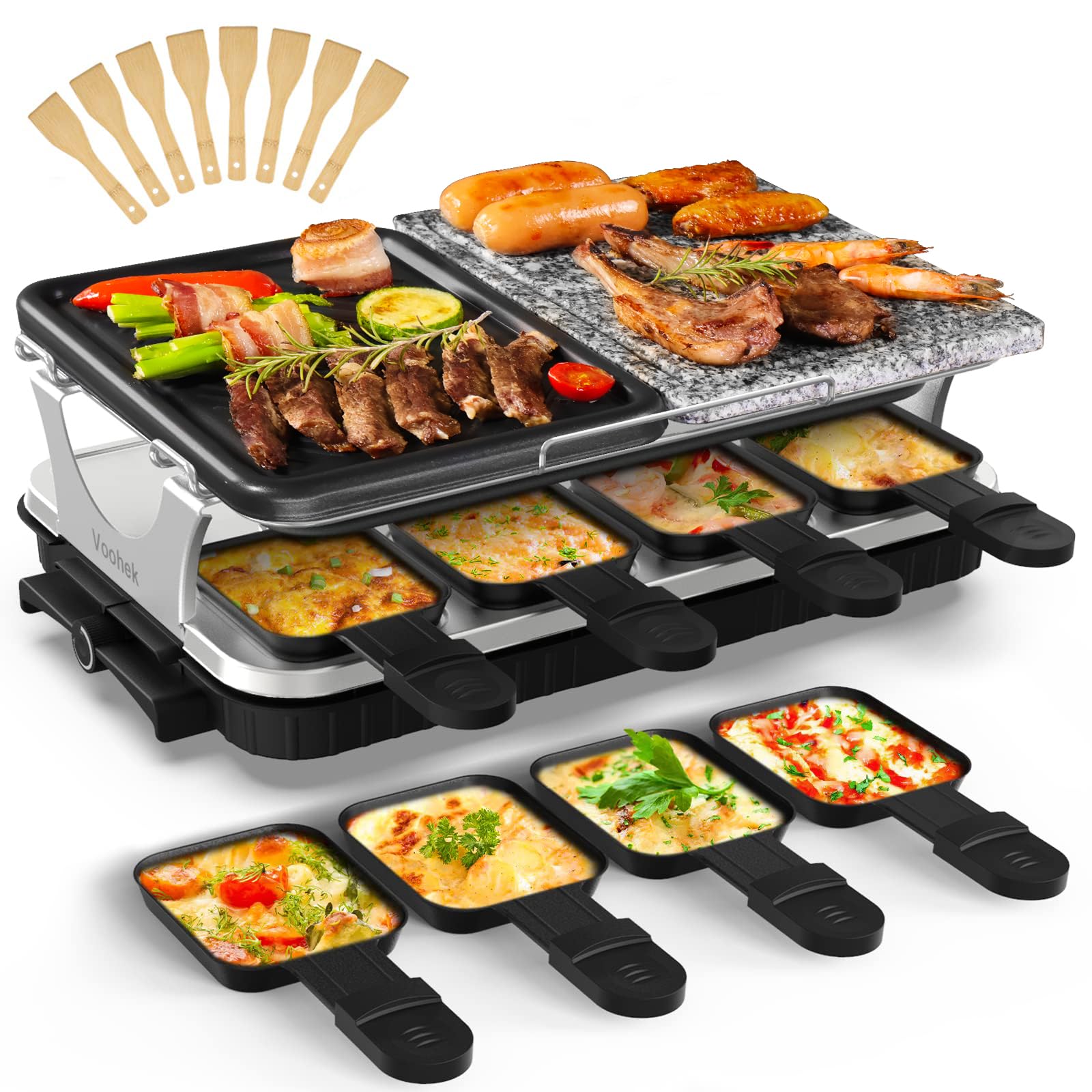 Voohek parrilla coreana para barbacoa raclette, parrilla interior sin humo, parrilla eléctrica hibachi grill 2 en 1, placa de parrilla antiadherente y piedra de cocina, temperatura ajustable, 8 - 【parrilla de raclette 2 en 1】esta parrilla coreana con una placa de parrilla antiadherente y piedra de barbacoa puede satisfacer varias necesidades. las ranuras en la parte inferior de la sartén raclette evitan que la comida se sumerja en aceite y aseguran el sabor de la comida. al mismo tiempo, la piedra natural de la parrilla tiene una función especial de preservación del calor - parrilla antiadherente de alta potencia: la parrilla de mesa raclette de 1300 w se puede calentar rápida y uniformemente, y cocinar fácilmente carne, mariscos y bistec en unos minutos. solo es necesario precalentar antes de usar durante 3 minutos para alcanzar los 500 °f. la perilla de la parrilla raclette te permite ajustar la temperatura y el calor para que la comida deliciosa ya no espere - 8 sartenes de raclette: nuestra parrilla de mesa raclette está equipada con 8 sartenes independientes para raclette que pueden preparar deliciosa comida para varias personas al mismo tiempo, y esta parrilla coreana también se puede utilizar para hacer queso, salsa de carne, mantequilla, etc. muy adecuado para reuniones familiares. además, todas las placas se pueden desmontar de forma independiente, lo que es fácil de limpiar y almacenar - no solo para barbacoa: esta es una parrilla coreana multifuncional que se puede utilizar para el desayuno, el almuerzo y la cena. para el desayuno, use la parrilla coreana de barbacoa para hacer panqueques, tortillas, pan y tocino. para el almuerzo y la cena, la barbacoa coreana también se puede utilizar para asar queso, carne a la parrilla, filete de pollo, pescado, verduras, etc. además, se pueden utilizar 8 paletas para satisfacer las necesidades diarias - servicio al cliente sin preocupaciones: voohek se compromete a proporcionar el mejor servicio. ofrecemos una política de retirar un producto de 60 días sin preocupaciones. nuestra parrilla de mesa raclette ha pasado la certificación fcc. si tienes algún problema, no dudes en ponerte en contacto con nosotros, te responderemos en 12 horas. elige voohek sin riesgo
