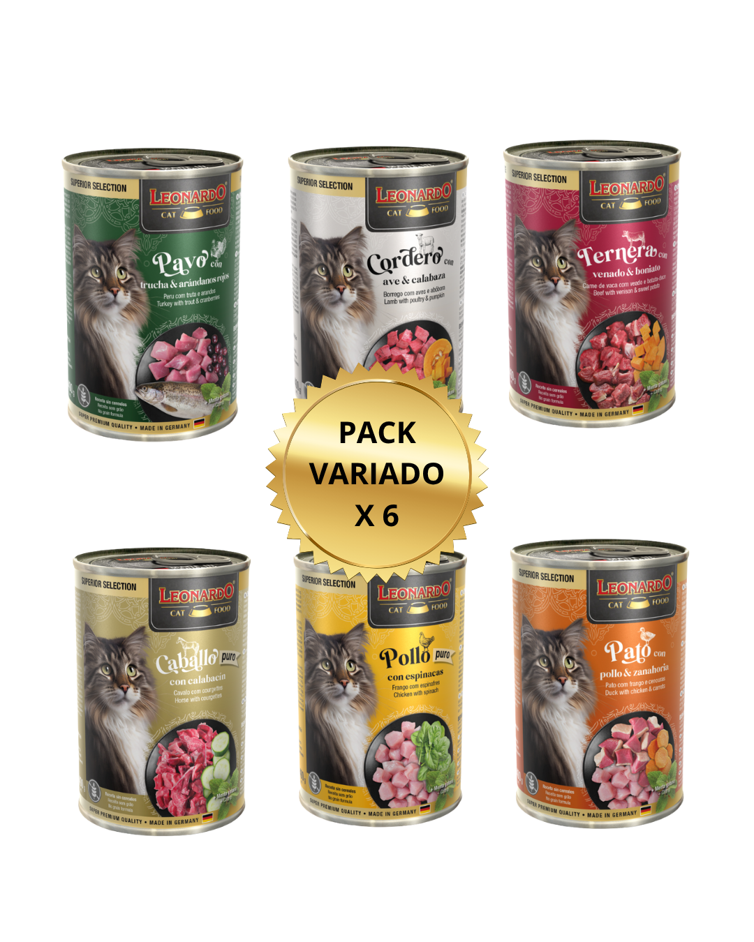 Leonardo pack de alimento humedo x 6 latas de diferentes sabores: pavo trucha arandanos, pato pollo y zanahoria, pollo espinaca, ternera venado camote, cordero ave calabaza, caballo calabacín. variadas segun stock disponible. formato: 6 latas variadas de 400g cada una.