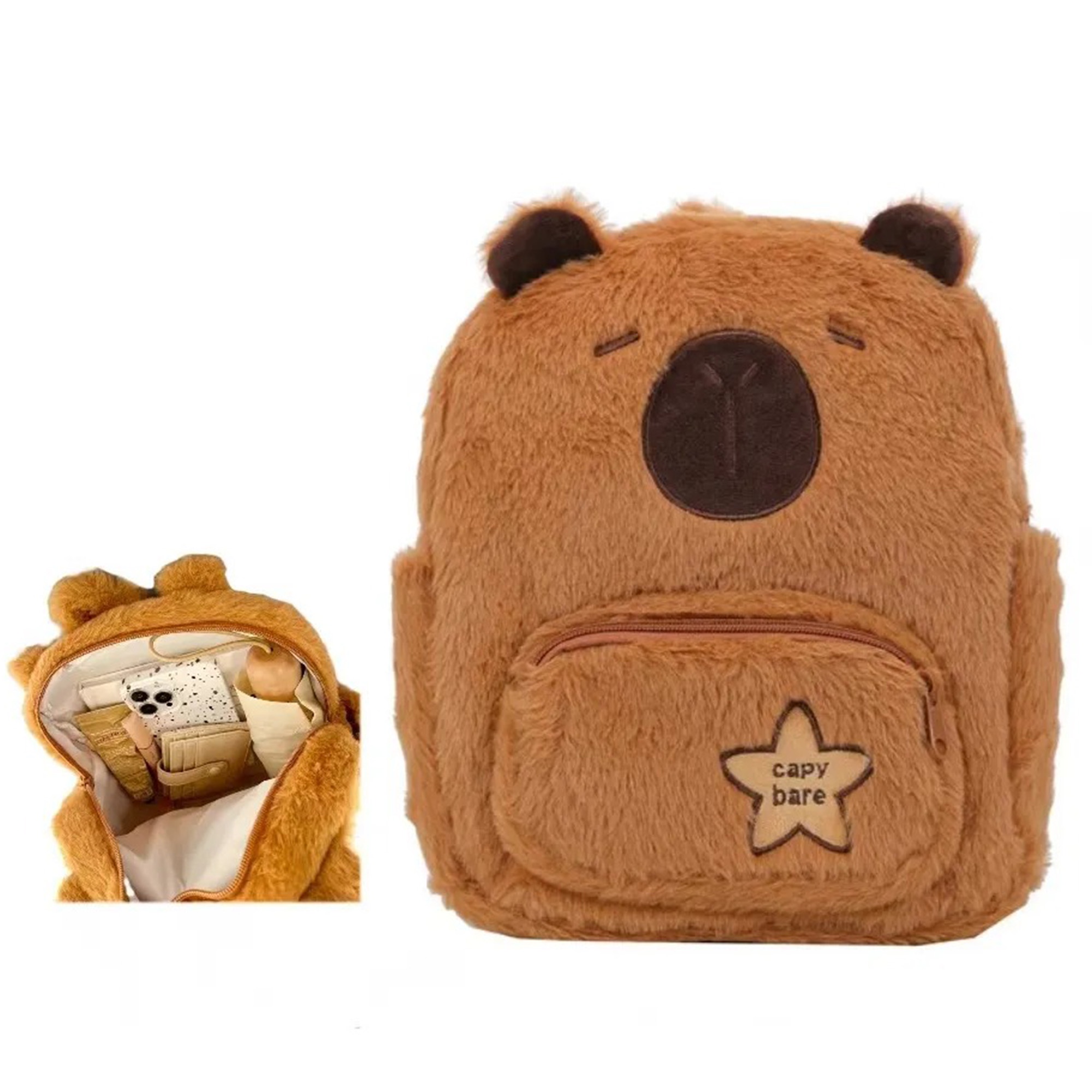 Mochila de peluche capibara tierno kawaii. regalos de vacaciones y cumpleaños características de diseño: adorable mochila de peluche con temática de capibara, con adorables detalles faciales bordados y un logo de estrella en el bolsillo frontal.