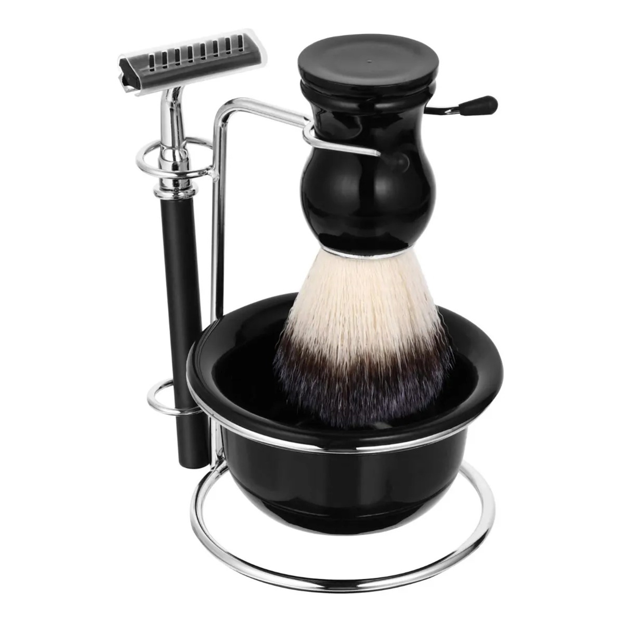 Set de barba clasico hisopo + rastrillo + base con pocillo color negro