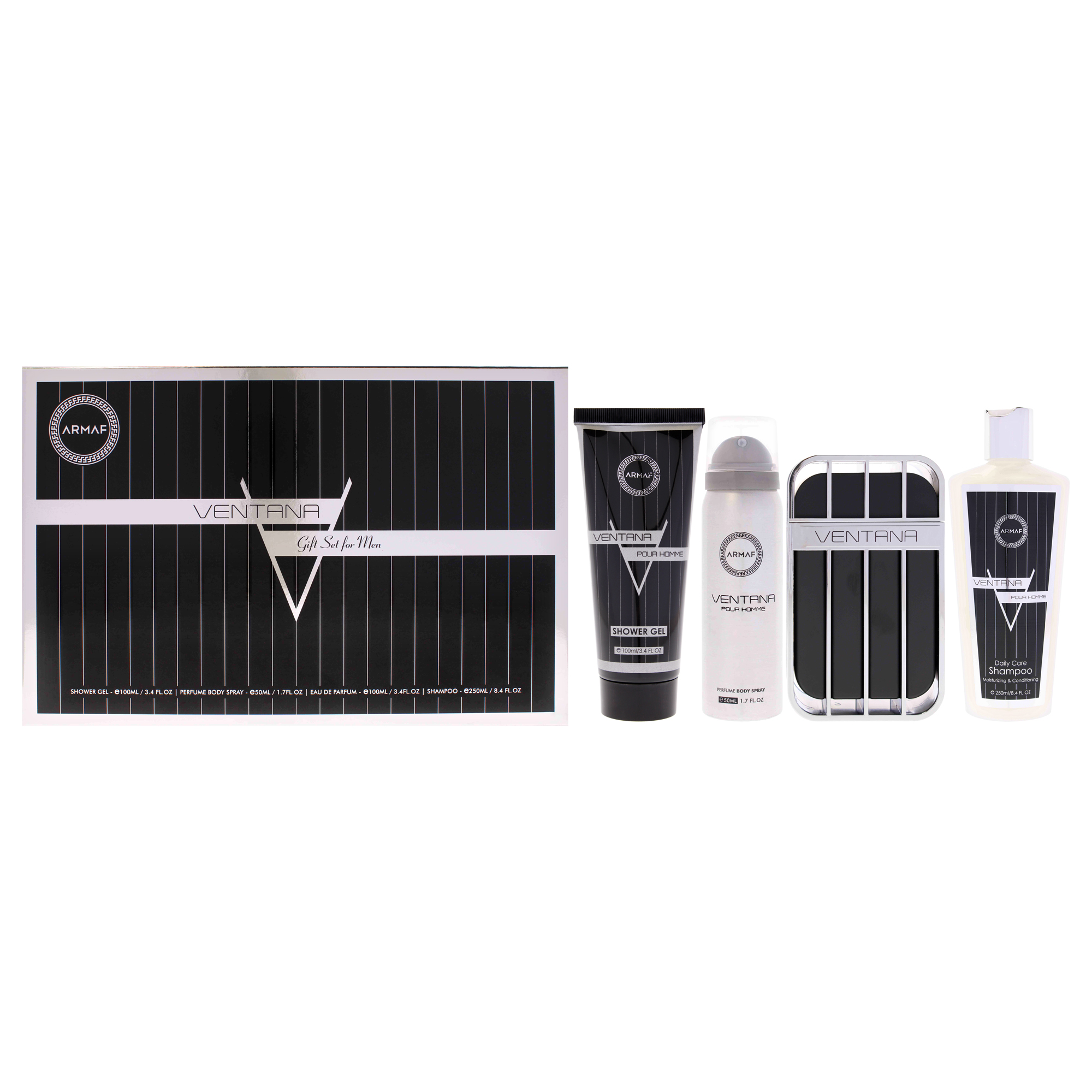 Set de regalo armaf ventana para hombre con 4 piezas: eau de parfum spray 100ml, gel de ducha 100ml, shampoo 250ml y spray corporal 50ml.