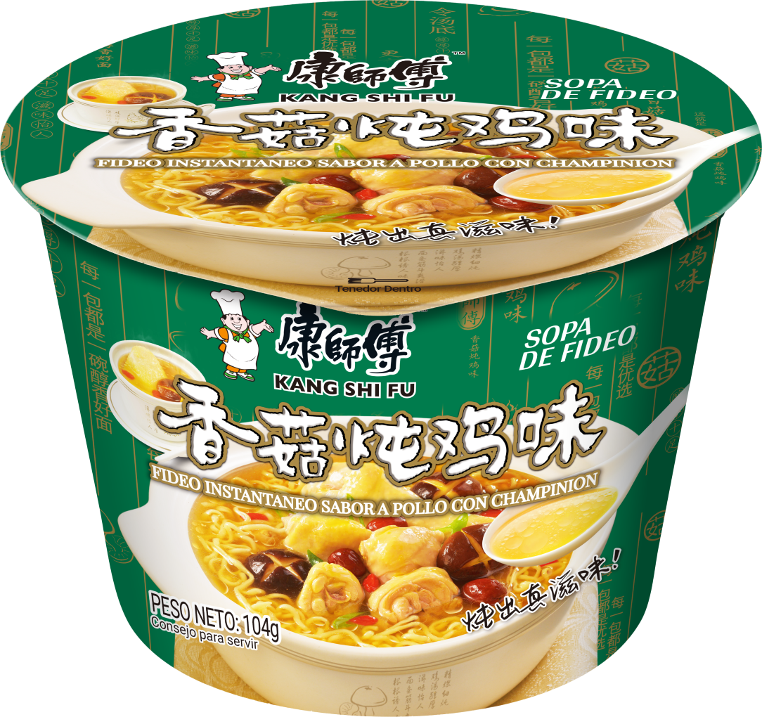 Fideo instantaneo - sopa de fideo kang shi fu, sabor a pollo con champiñón 104g*pote.