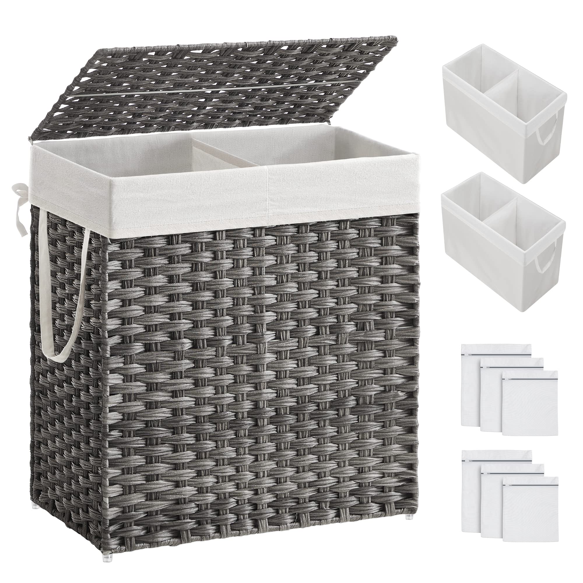 Songmics cesta de lavandería con tapa, cesta de ropa de 110 litros con 2 bolsas de forro extraíbles, 6 bolsas de malla, canasta de mimbre para lavandería, canasta doble para ropa sucia para baño, 13 x - [con tapa y 2 secciones] la tapa mantiene los olores en la cesta de lavandería y el polvo fuera. si es necesario, puedes abrirlo con una sola mano; las 2 secciones clasifican tu ropa en oscuros y blancos antes del día de la lavandería - [2 forros lavables, incluye 1 repuesto] esta cesta de lavandería viene con un forro adicional para que puedas cambiarla mientras se lleva a la lavandería o a la lavadora con las 2 asas. y ambas bolsas son lavables para mantenerse higiénicas - marco de acero estable y ratán sintético transpirable: fabricado con un marco de acero resistente y ratán sintético seleccionado, esta canasta de lavandería con tapa es estable, impermeable, transpirable y puede permanecer seca en ambientes húmedos - [gran capacidad] tamaño de 13 pulgadas de largo x 22.4 pulgadas de ancho x 23.6 pulgadas de alto, esta cesta de lavandería con tapa cuenta con una gran capacidad de 29 galones, capaz de contener la ropa de una familia durante toda una semana - [6 bolsas de malla para lavandería incluidas] esta cesta viene con 6 bolsas de lavandería para ayudarte a proteger tu ropa interior, calcetines u otros artículos delicados cuando los laves en la lavadora
