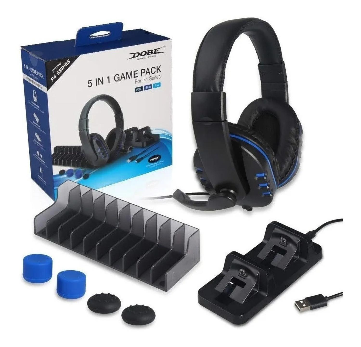 Pack gamer 5 en 1 dobe ps4 series con este pack dobe 5 en 1 con base de carga dual, cable de carga, auriculares con micrófono, soporte de almacenamiento de discos de juego, tapa de silicona para ps4, ps4 slim, ps4 pro, pc, portátil, smartphone y tablets. este paquete incluye todo lo que necesitas para jugar. - base de carga dual para cargar dos mandos de juegos ps4/ps4 pro/ps4 slim - auriculares de alta calidad con micrófono que permiten disfrutar fácilmente de sus juegos sin tipo - la cubierta de silicona mejorada protege el mando del juego, con un agarre cómodo - soporte de almacenamiento de disco para hasta 10 discos de juego - compatible con consolas ps4/ps4 slim/ps4 pro. el paquete incluye: 1 auriculares estéreo con micrófono. 1 soporte de almacenamiento para discos de juego (hasta 10 discos). 1 base de carga doble. 2 x pro y 2 x empuñaduras de base. 1 cable de carga de 80 cm. funciones y detalles - base de carga dual para cargar dos mandos de juego ps4/ps4 pro/ps4 slim - auriculares de alta calidad con micrófono que permiten disfrutar fácilmente de su juego sin tipo - la cubierta mejorada de silicona para el pulgar protege tu mando de juego, agarre cómodo - soporte de almacenamiento de disco para hasta 10 discos de juego - compatible con consolas ps4/ps4 slim/ps4 pro.