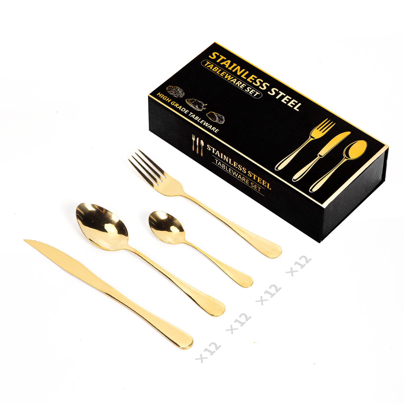 Decora y embellece tu hogar con vajilla elegante, brillante y generoso. el juego de cubiertos incluye 12 pcs tenedores, 12 pcs cuchillos, 12 pcs cucharas de mesa y 12 pcs cucharas de té.