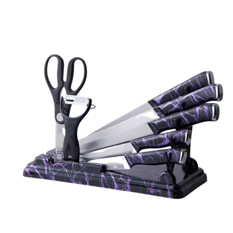 Mp - Set Cuchillos De Cocina 9 Piezas Con Base Giratoria Marmoleado Negro Plateado