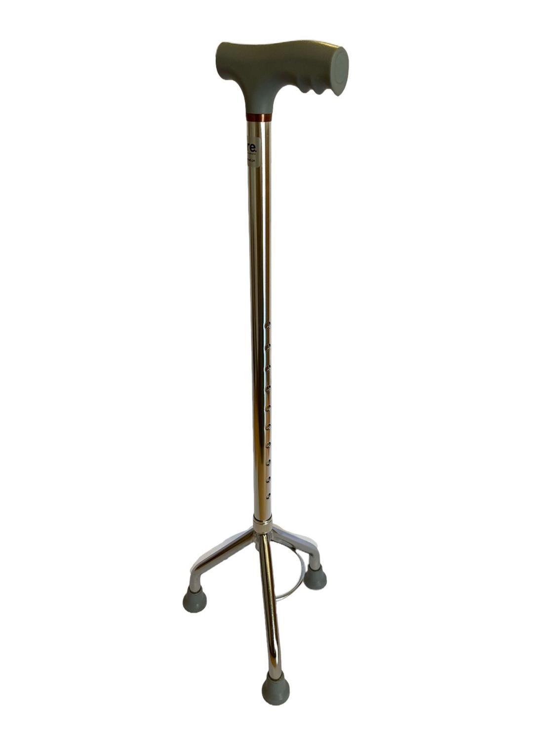 Diseñado para personas con limitaciones en las extremidades inferiores, este bastón de tres apoyos ofrece estabilidad y confianza al caminar. su estructura de aluminio liviano y resistente facilita el traslado y almacenamiento, mientras que los tres puntos de apoyo con regatones de goma antideslizante proporcionan seguridad en todo tipo de superficies. la empuñadura ergonómica de esponja de alta densidad asegura un agarre cómodo y firme. además, su altura ajustable (72–95 cm) con seguro especial permite adaptarlo a cada usuario, brindando independencia y practicidad en la movilidad diaria. especificaciones técnicas - material: aluminio resistente y liviano - empuñadura: ergonómica, antideslizante, esponja de alta densidad, color gris - regatones: 3 unidades de goma antideslizante con placa metálica interior - ancho de empuñadura: 4 cm - largo de empuñadura: 12 cm - espesor del tubo inferior: 1,5 mm - diámetro inferior del regatón: 37 mm - capacidad máxima: 100 kg