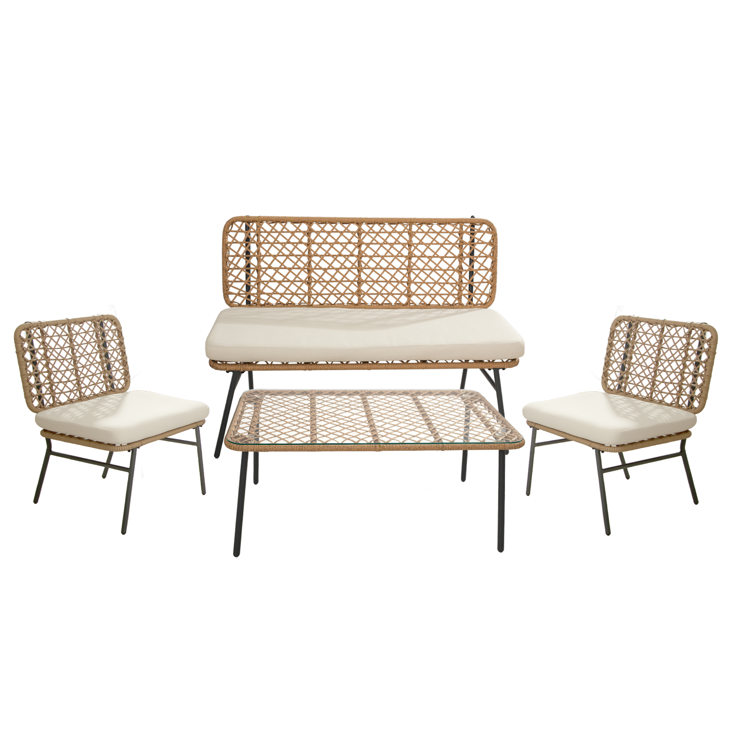 Renueva tu espacio exterior con este juego de terraza 4 piezas estilo ratán sintético, perfecto para quienes buscan muebles de jardín resistentes al clima y con diseño contemporáneo. este set incluye dos sillones individuales, un sofá doble y una mesa de centro para exterior, ideal para terrazas, balcones, patios o quinchos.