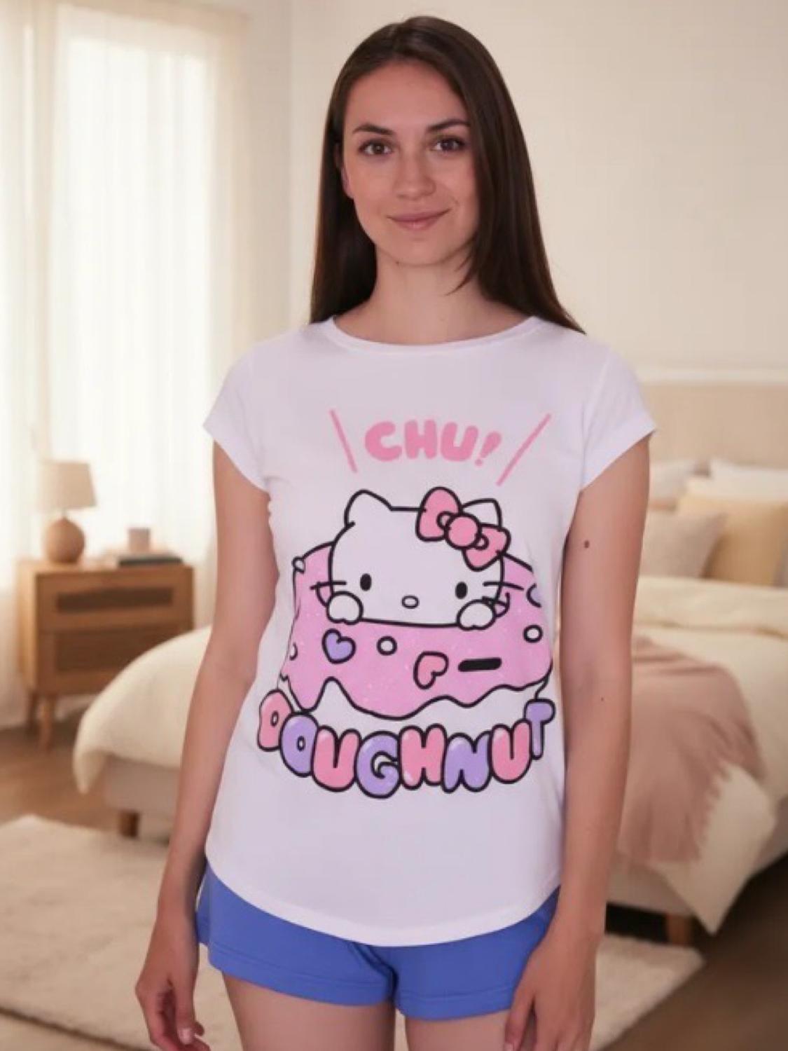 Pijama mujer hello kitty: diversión y comodidad para tus noches añade un toque dulce a tus noches con este encantador pijama de algodón. la polera de manga corta en color blanco tiene un calce regular y presenta un adorable estampado de hello kitty escondida dentro de una deliciosa dona, que le da un aire divertido y juguetón. el short en color azul, también de calce regular, completa este conjunto fresco y cómodo, ideal para los días cálidos. especificaciones técnicas: • tipo de prenda: pijama • color de la polera: blanco • estampado: hello kitty escondida en una dona • calce de la polera: regular • color del short: azul • calce del short: regular • composición: 50% algodón, 50% poliéster • origen: fabricado en chile instrucciones de cuidado: • lavar a máquina con agua fría • no usar secadora • no planchar el estampado beneficios: • tejido suave y ligero que garantiza comodidad durante la noche. • diseño divertido que añade un toque de alegría a tu vestuario. • ideal para momentos de relajación en casa o noches de descanso. ¡disfruta de la ternura y comodidad de este adorable pijama de hello kitty! ¡haz clic para agregarlo a tu carrito y lleva la diversión a tus noches!