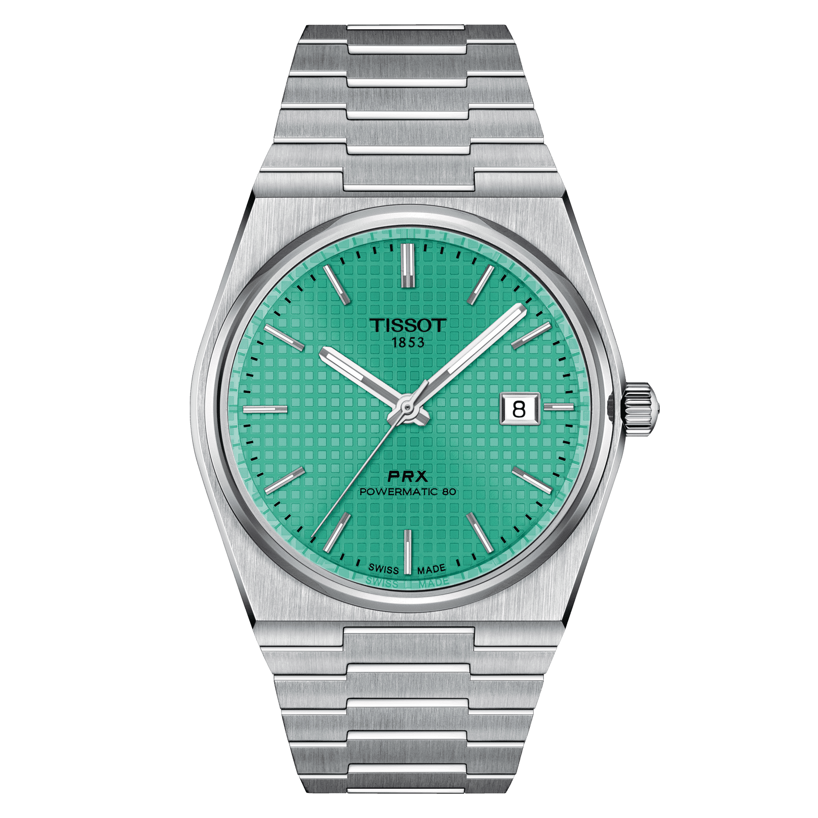 Reloj de moda para hombre tissot prx powermatic 80 automático con esfera verde claro, modelo auténtico y nuevo t137.407.11.091.01. caja y pulsera de acero inoxidable cepillado con cierre desplegable y botón pulsador. bisel fijo y cristal de zafiro resistente a rayaduras. movimiento automático suizo con reserva de marcha de 80 horas. resistente al agua hasta 100 metros.