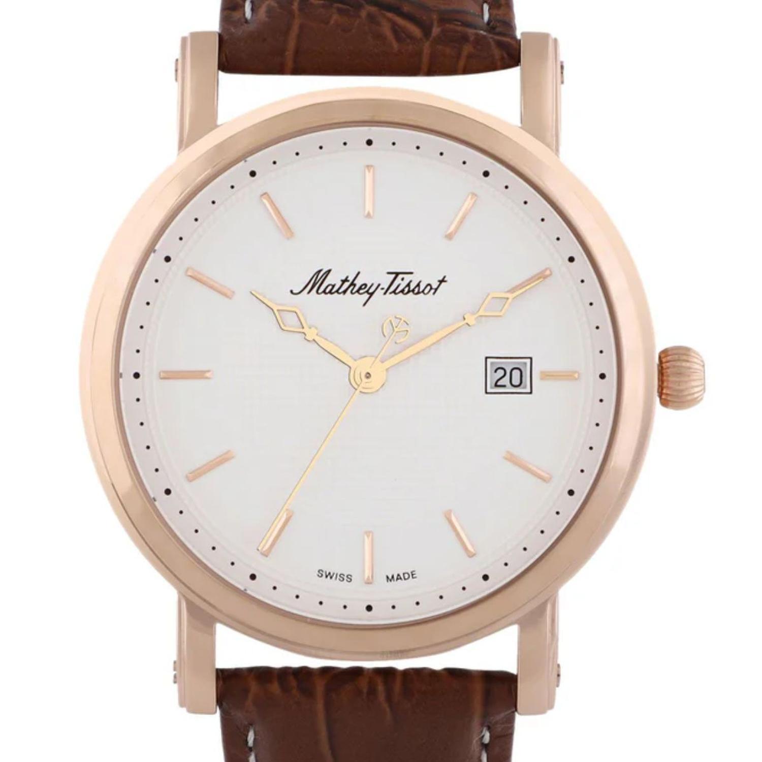 Mathey-tissot es una marca suiza reconocida por sus relojes de alta calidad y diseño elegante. fundada en 1886, combina tradición y modernidad en cada pieza. sus relojes destacan por la precisión de sus mecanismos, muchos de los cuales son automáticos, y por la atención al detalle en la manufactura. la colección abarca desde modelos clásicos hasta deportivos, todos con materiales premium como acero inoxidable y piel genuina. además, los diseños incluyen esferas elaboradas, detalles brillantes y funciones útiles, como cronógrafos y resistencia al agua. mathey-tissot ofrece una fusión perfecta de estilo y funcionalidad para los amantes de la relojería. genero: unisex tipo de maquinaria: cuarzo nombre de maquinaria: ronda 505 funciones: fecha diametro: 38mm material de caja: acero inoxidable 316l color de la caja: oro rosa cristal: recubierto de zafiro tapa trasera: acero inoxidable 316l corona: tirar / empujar resistencia al agua: 5 atm tipo de bisel: fijo color del bisel: oro rosa espesor: 8 mm color esfera: blanco ancho terminal: 20 mm material correa: cuero color correa: marron